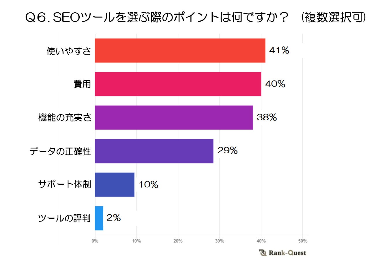 SEOツールを選ぶ際のポイントとして最も重視されているのは「使いやすさ」(41%)、次いで「費用」(40%)、「機能の充実さ」(38%)、「データの正確性」(29%)でした。