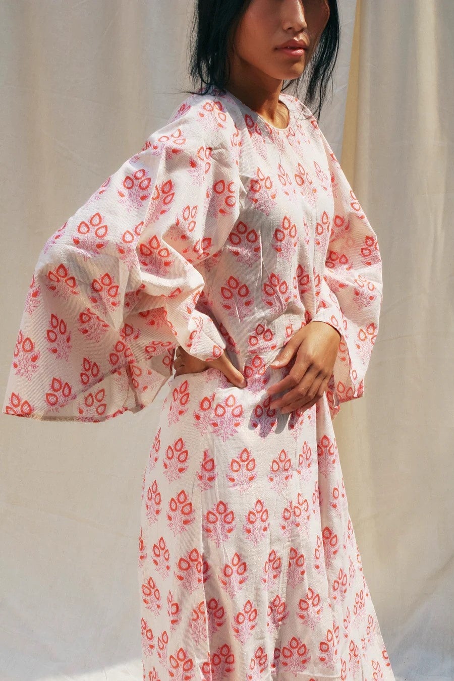 「エスゼット ブロックプリント」では珍しい、ウエストがシェイプされた美しいシルエットが印象的なマキシ丈ドレス。動くたびにひらりと揺れるベルスリーブが、一つ一つの所作を美しく魅せてくれます。乙女心をくすぐるピンクの華やかなカラーリングに金糸を編み込んだ職人の腕が光る1着と、ブランドを代表する草花プリント”NILA/ニラ”を全体にあしらい上品なブルーが落ち着いた雰囲気を演出してくれるドレスをご用意しました。
