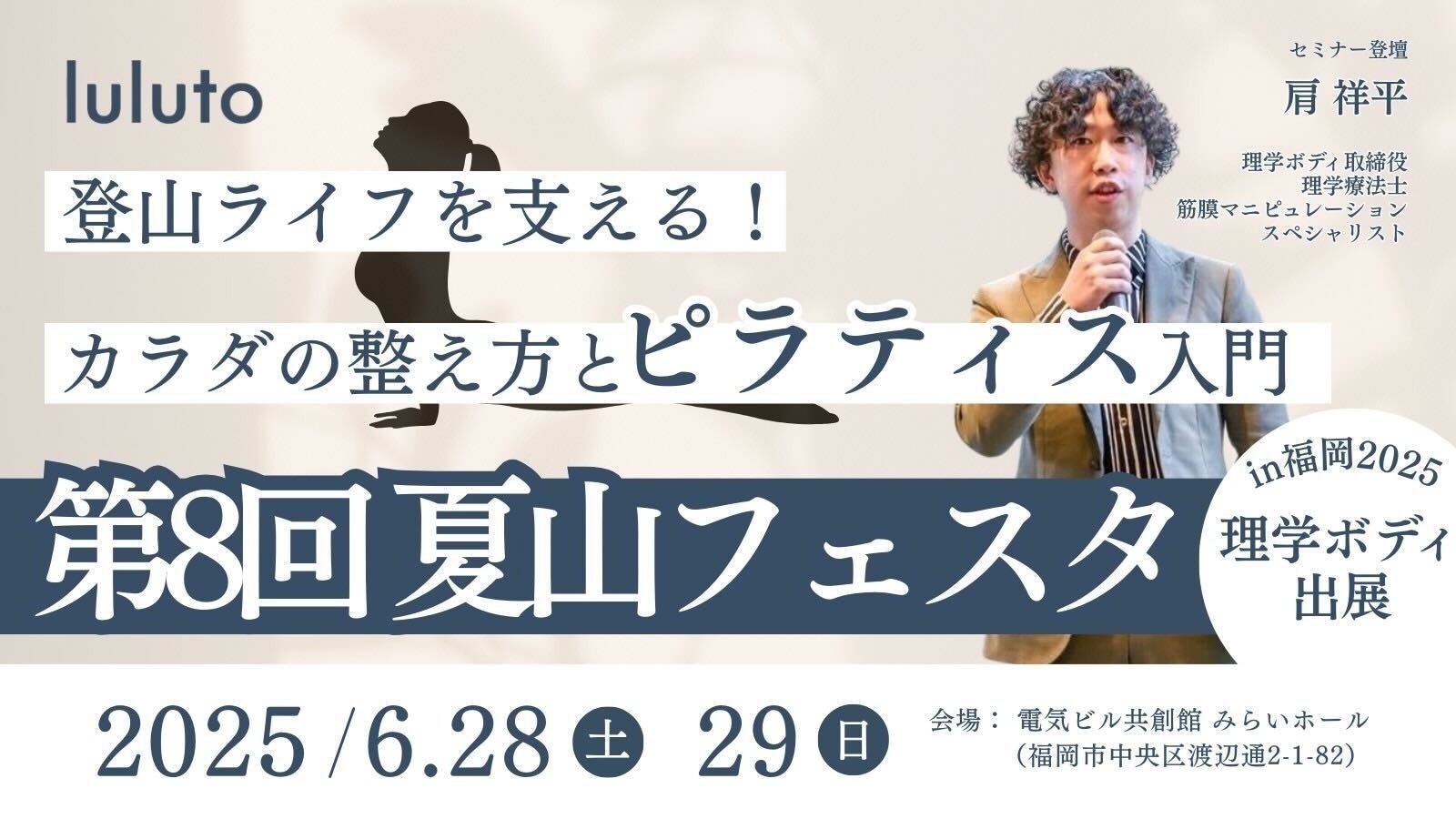 理学療法士の技術で世界中の人々を健康にすることを目指す株式会社理学ボディ(本社:東京都渋谷区、代表:木城拓也)は、2025年6月28日(土)・29日(日)に福岡で開催される「第8回 夏山フェスタin福岡」に出展します。登山時に起こりやすい膝や足の負担に対して、筋膜の構造や身体の使い方に基づいたセルフケアやエクササイズを通じ、参加者のみなさまの体づくりをサポートします。