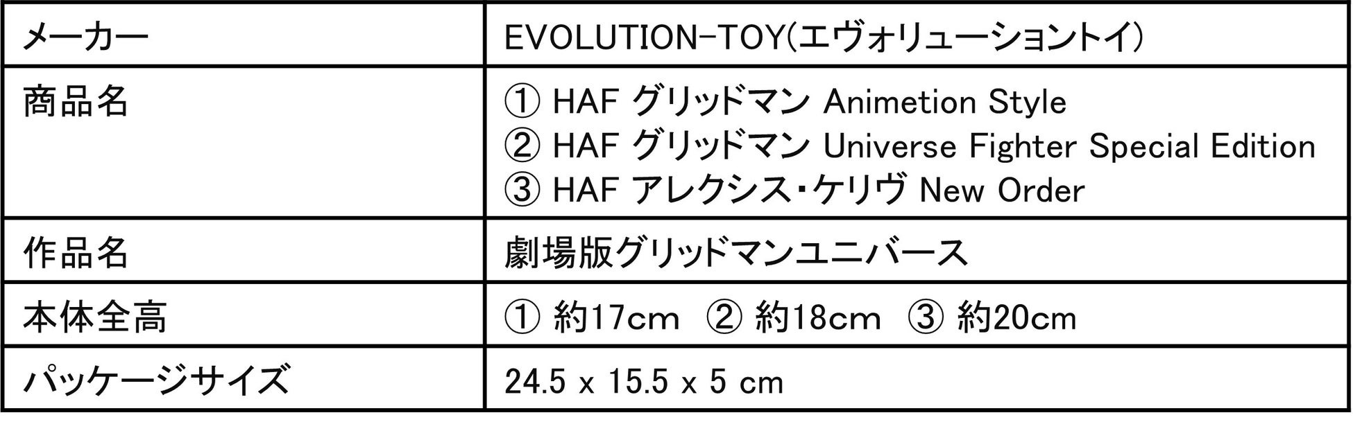 株式会社ホビーサーチ(東京都墨田区 代表取締役社長:川畑 泰史)は、株式会社EVOLUTION・TOYから2024年10月発売予定の『HAF グリッドマン Universe Fighter Special Edition』『HAF アレクシス・ケリヴ New Order』『HAF グリッドマン Animetion Style』の予約受付および、写真撮影を敢行したことをお知らせします。