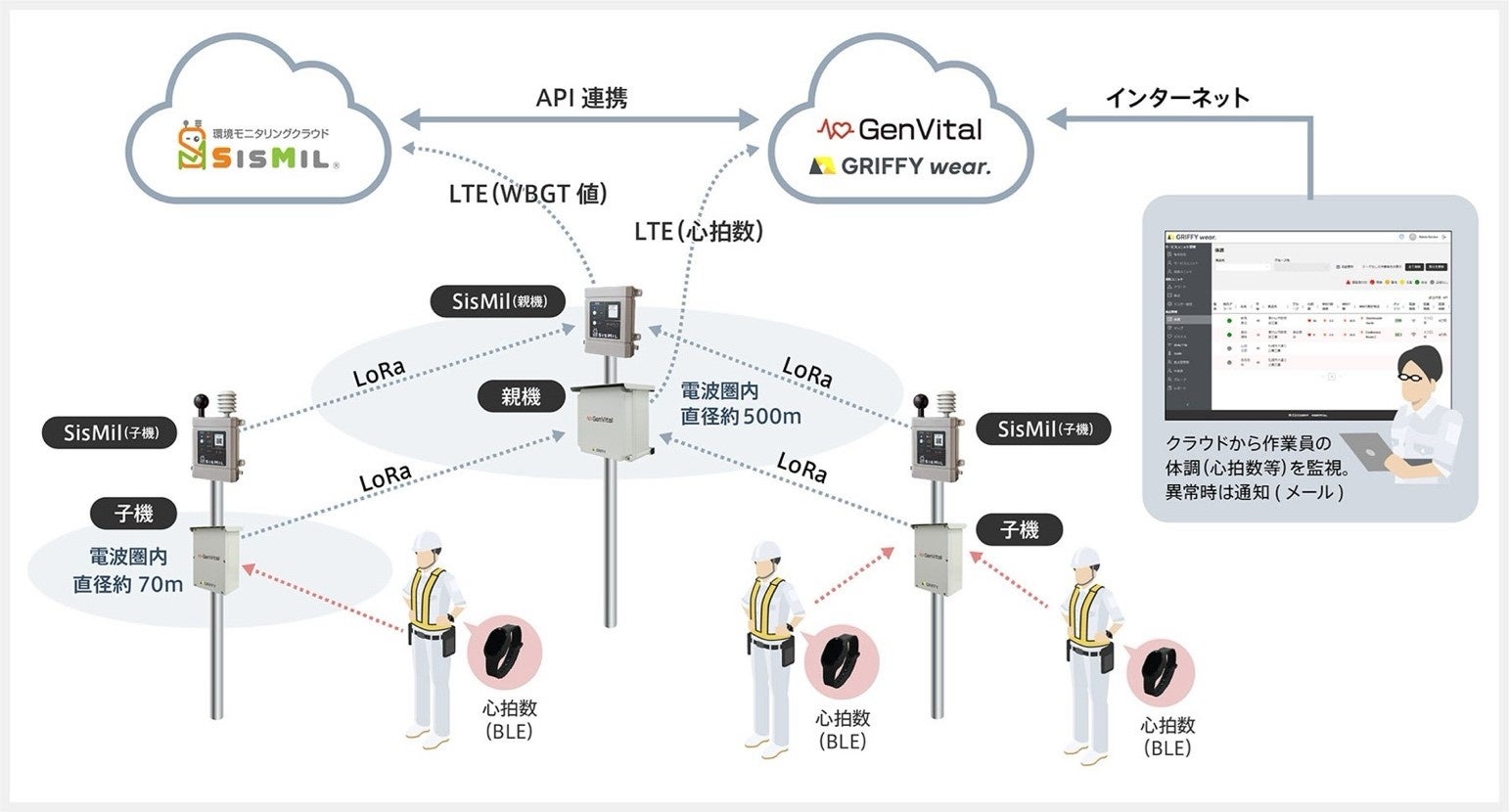 ○専用クラウドサーバ「GRIFFY Wear.」にLTE通信にてデータを送信する親機、心拍数データを収集する中継機、現場作業員が装着し心拍数を計測するリストバンド※から構成されます。リストバンドから中継機の通信はBLE、中継機から親機への通信はLoRaを使用し、暑さ指数計測およびデータ収集は、環境モニタリングクラウド「SisMil」※を使用します。