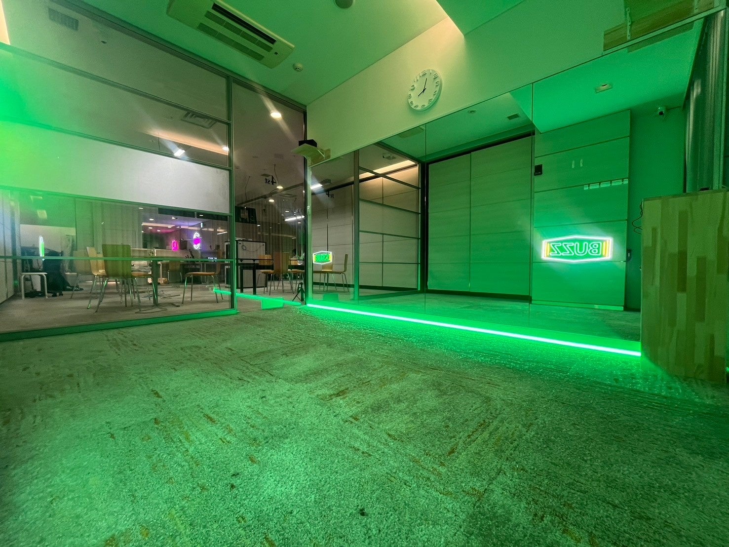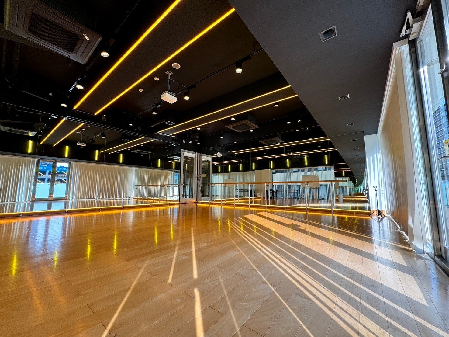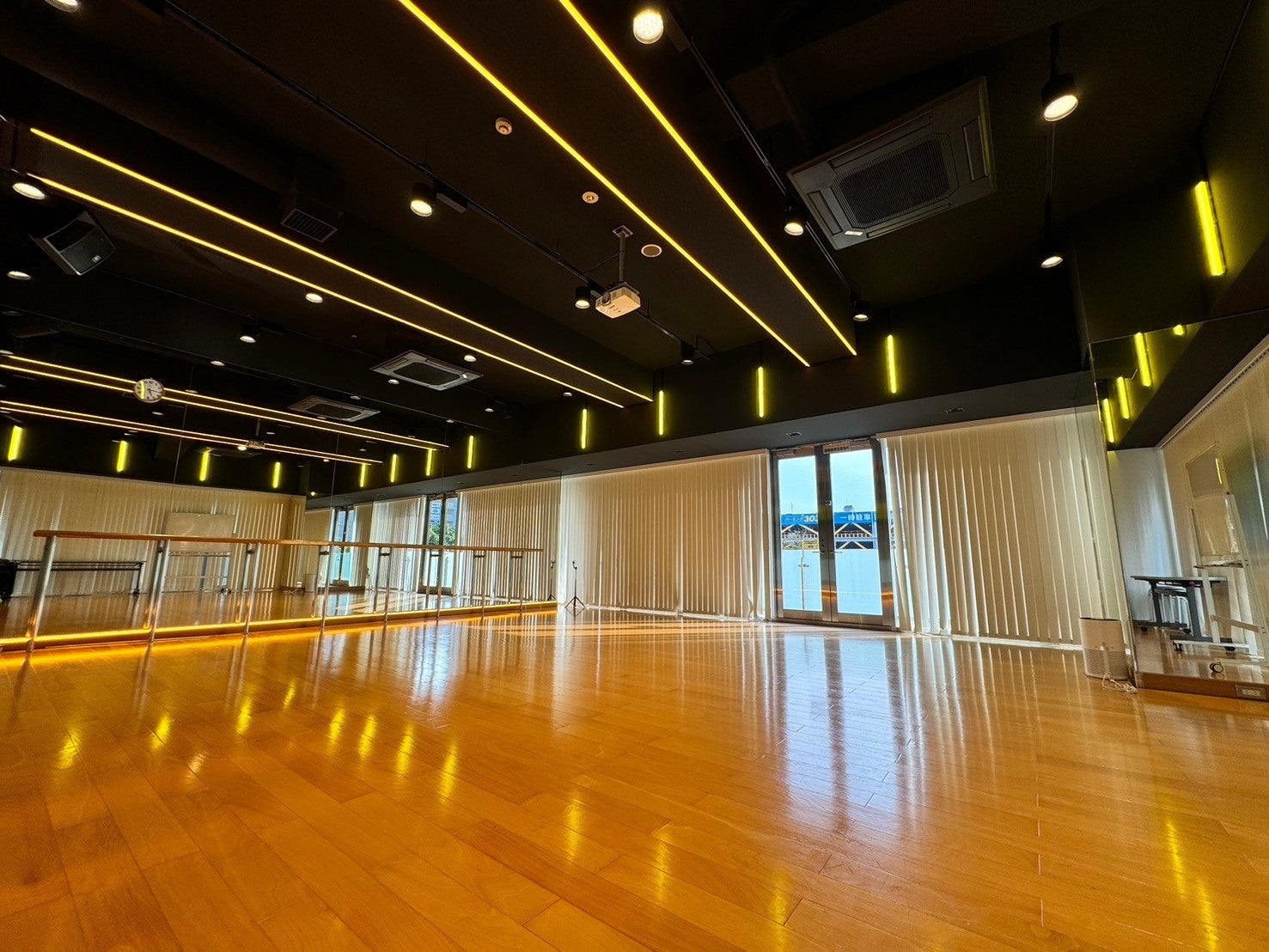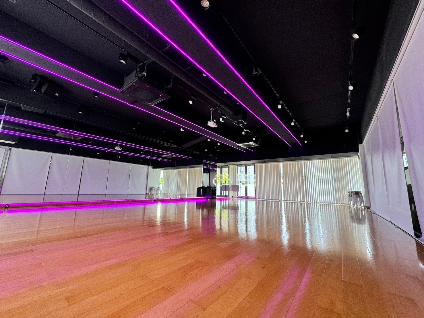 昼間は光差し込む開放感を、夜はこだわりのLEDが映えるサイバー空間に変身する、撮影にもおすすめのスタジオです。高音質スピーカー2台導入、二面ミラー完備かつ、15-20名ほどでの利用可能な広さがあるため、ワークショップ、リハーサル、レッスンでも使いやすい大型スタジオです。30分500円〜ご用意しております。