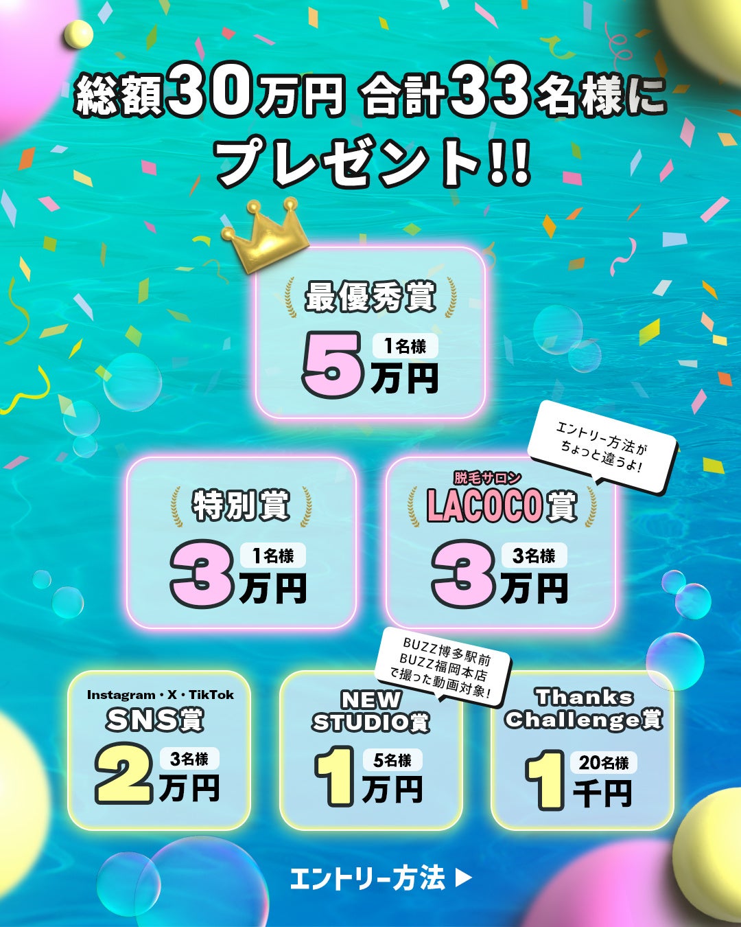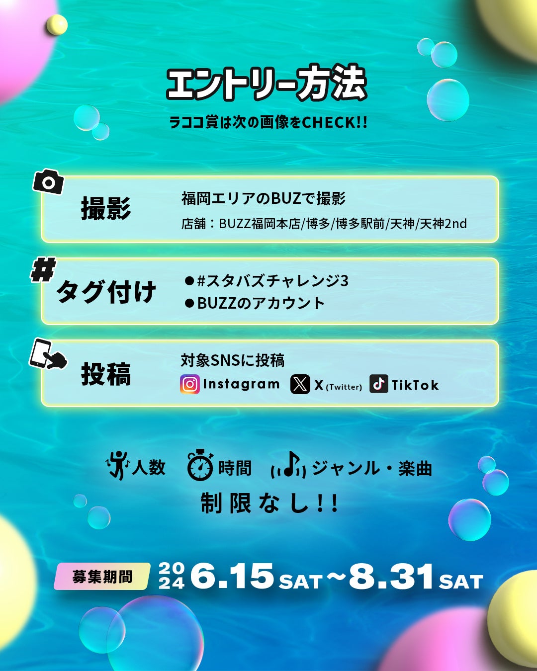 をタグ付けして、Instagram、TikTok、 Xに投稿投稿するだけでエントリーが可能となります。また、ご参加くださった方、全員をSTUDIO BUZZの公式アカウントにてご紹介させていただきます。