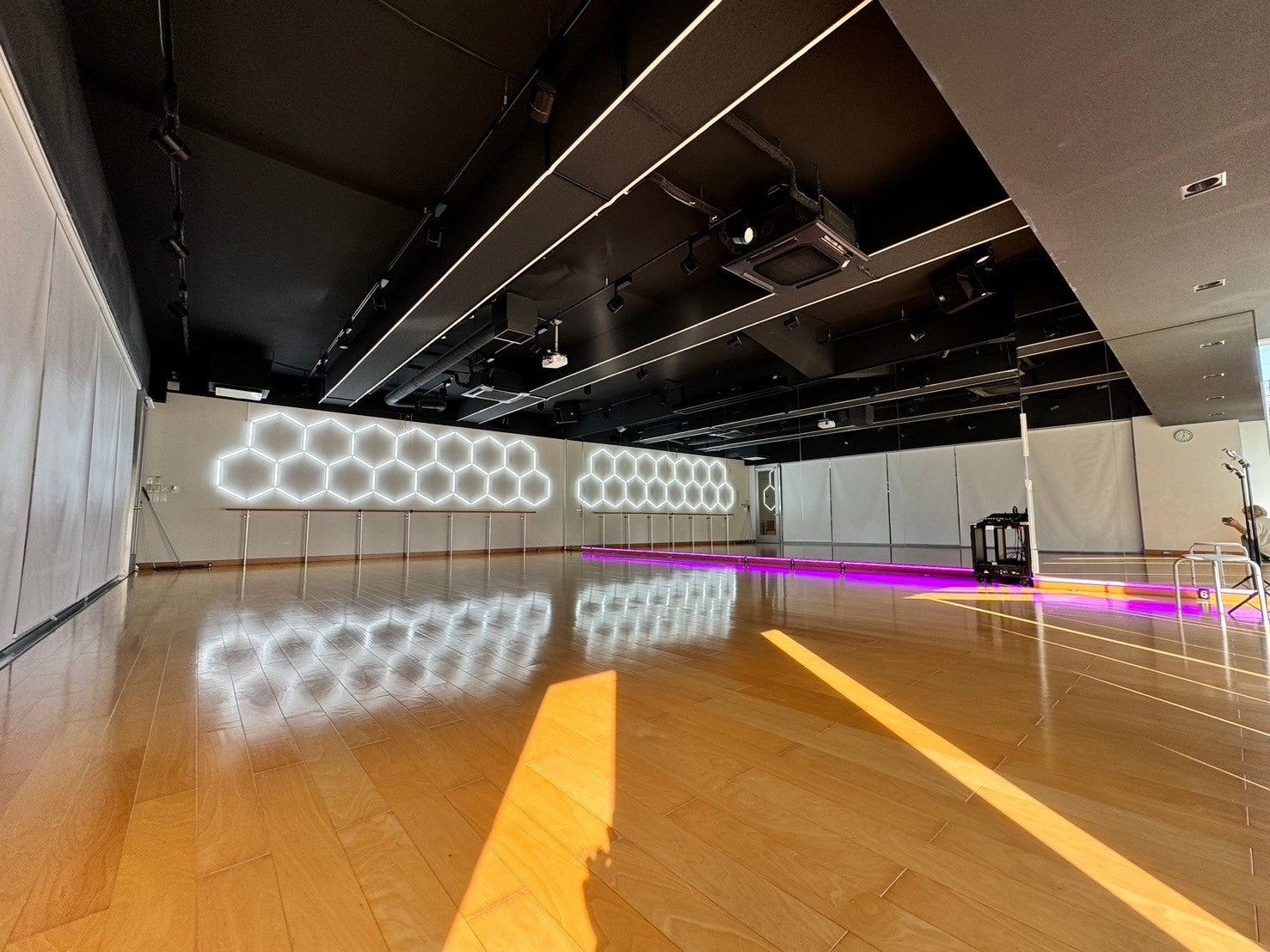 大人気の幾何学模様LEDが導入され、高音質スピーカーも完備のスペシャルなスタジオです。エリア最大級の広さのため、ワークショップ、撮影、リハなど、様々な使用用途でお使いいただけます。30分500円〜ご用意しております。