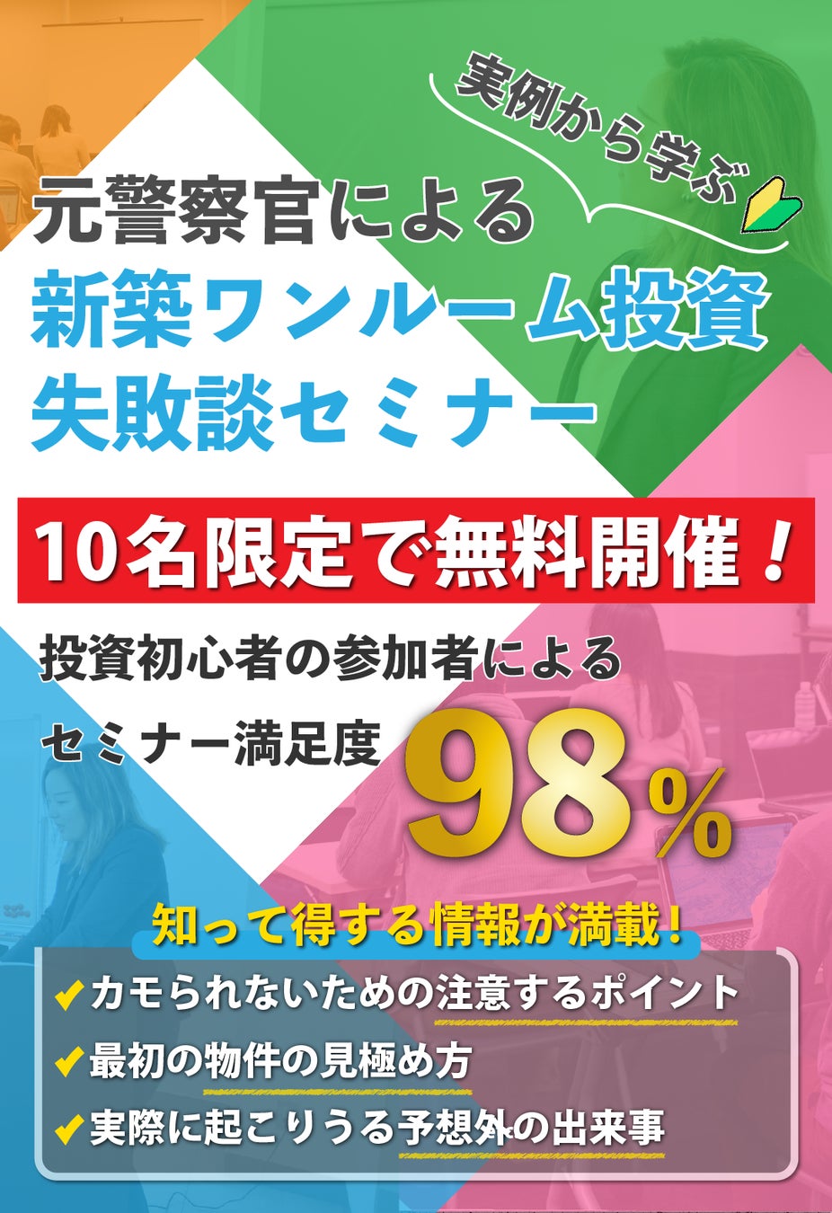 講師の実体験談から、不動産投資しくじり回避法を面白おかしく学べる人気のセミナー。