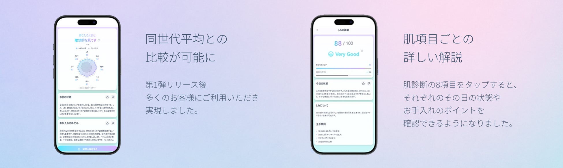 自身の肌診断結果を同世代の平均値と比較できる機能を追加。客観的な視点から自身の肌状態を知ることで、スキンケアへのモチベーション向上につながります。これは第1弾リリース後、多くのお客様にご利用いただいたことで診断データが蓄積されたことにより、実現した機能です。