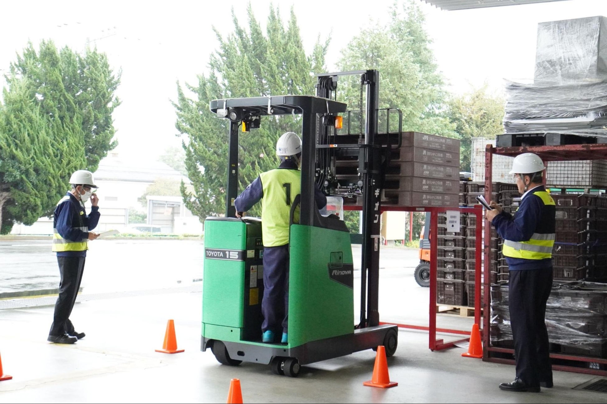 実技試験では、現場で最も使用頻度の高いリーチフォークを使用し、ネステナー(スチール製の保管ラック)の上に積まれたパレットのブロックを、向かい側のネステナーへ移動させるというコースに挑みました。採点項目は細かく分かれており、基本的な操作から荷役作業まで、日頃の作業の正確性が問われました。