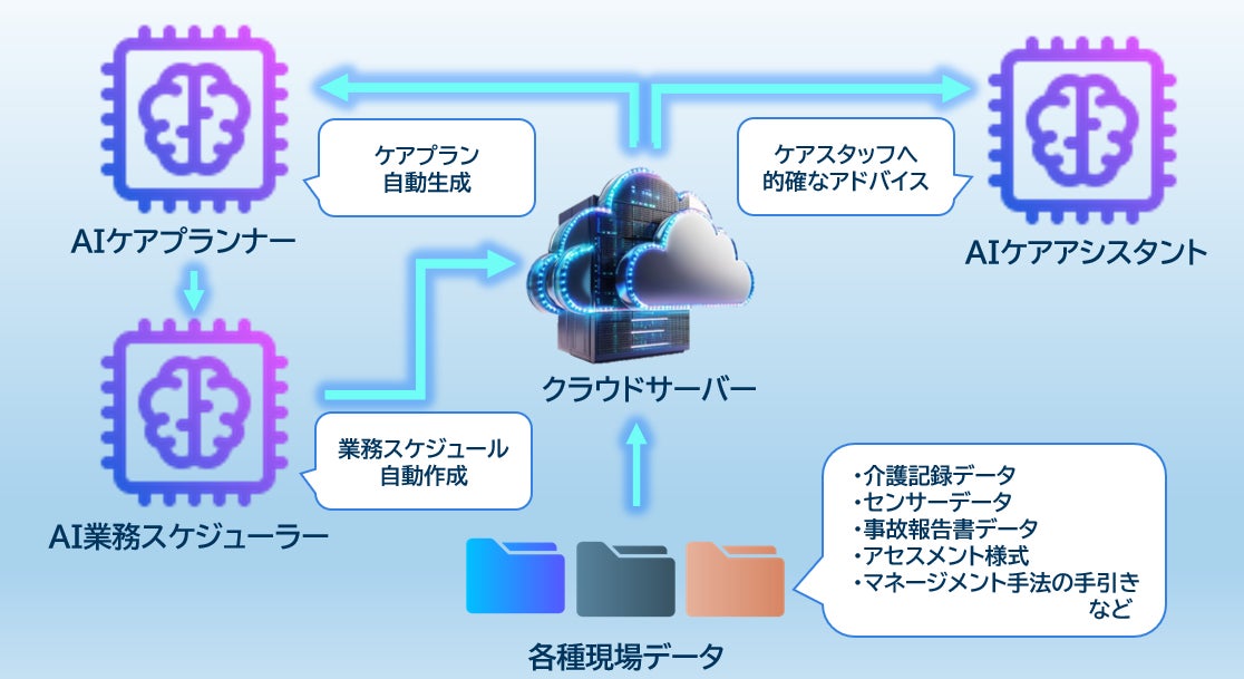「AIケアプランナー」による、よりきめ細かなケアプラン作成をめざすとともに、ケアスタッフの早期立ち上げおよびスキル標準化を実現する「(仮称)AIケアアシスタント」と、ケアスタッフの業務スケジュールの自動作成により、さらなる現場負荷軽減を実現する「(仮称)AI業務スケジューラー」に拡張させ、介護現場で働く皆さまに対してDX化を加速することで、介護業界の生産性向上や人材不足課題の解決をめざします。