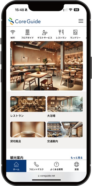 スマホソリューション『Core Guide』は館内に設置したQRコードを宿泊客様が※3を読み込むことでスマートフォンから館内案内、チェックアウトの時間やWi-Fiのパスワード、レストランや大浴場の混雑状況を閲覧可能にするサービスです。スマートフォンに情報を集約することでフロントへの問い合わせ削減、ペーパーレス推進で利益率向上の効果が見込めます。