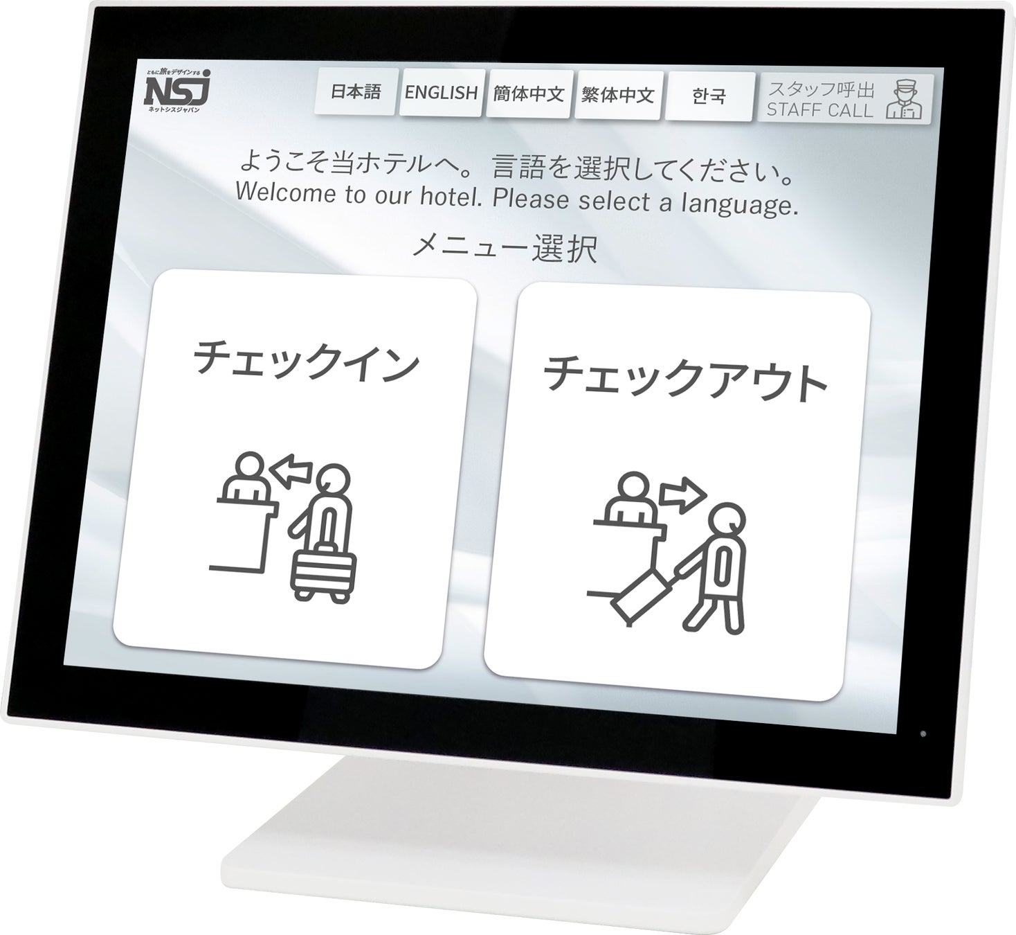 立地や戦略に合わせて自立型、卓上型、タブレット型、タッチパネルPC型と複数のタイプを提供しております。多言語機能も実装しており、海外のスタッフや宿泊客様も負担なく利用できます。