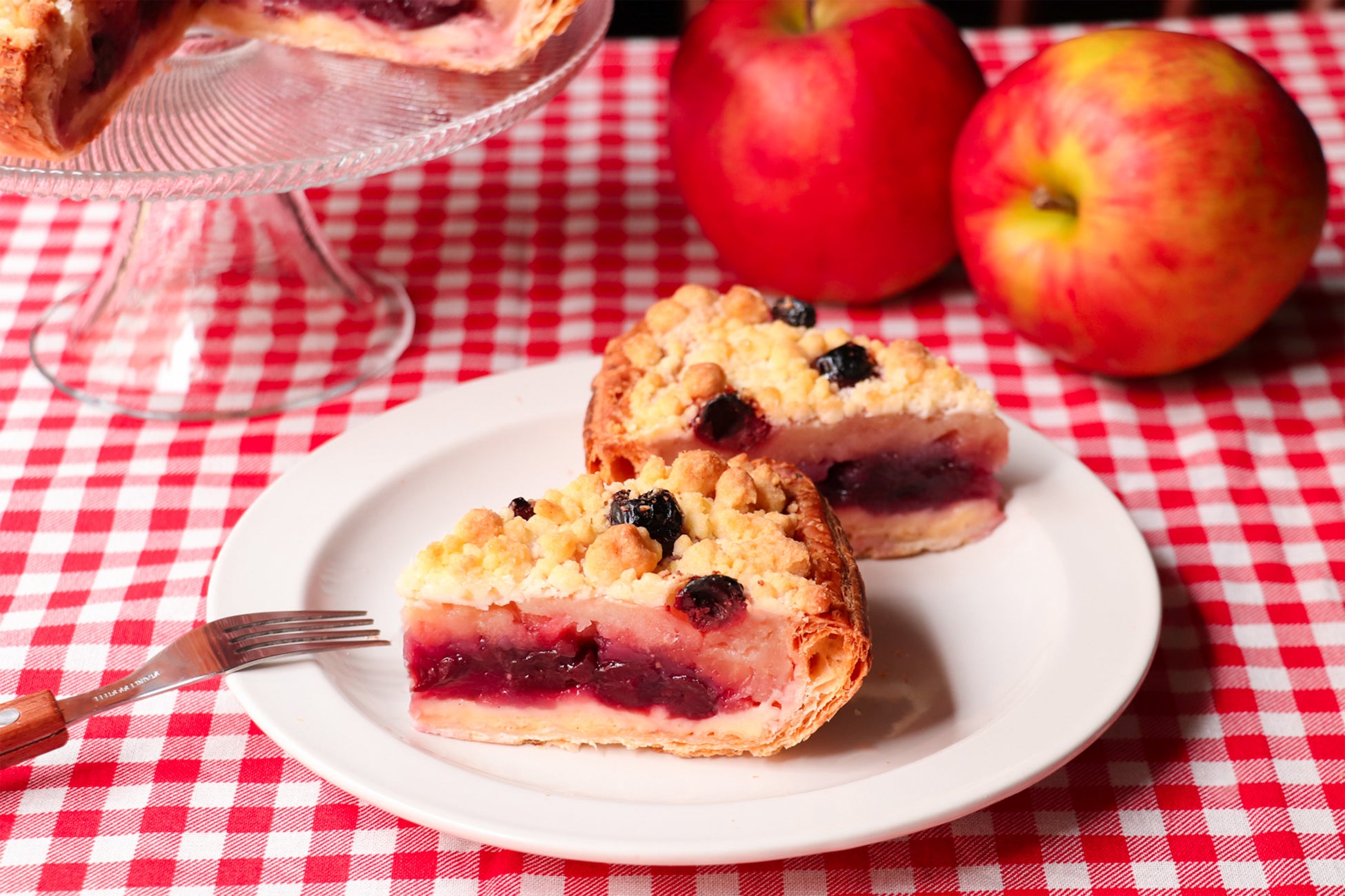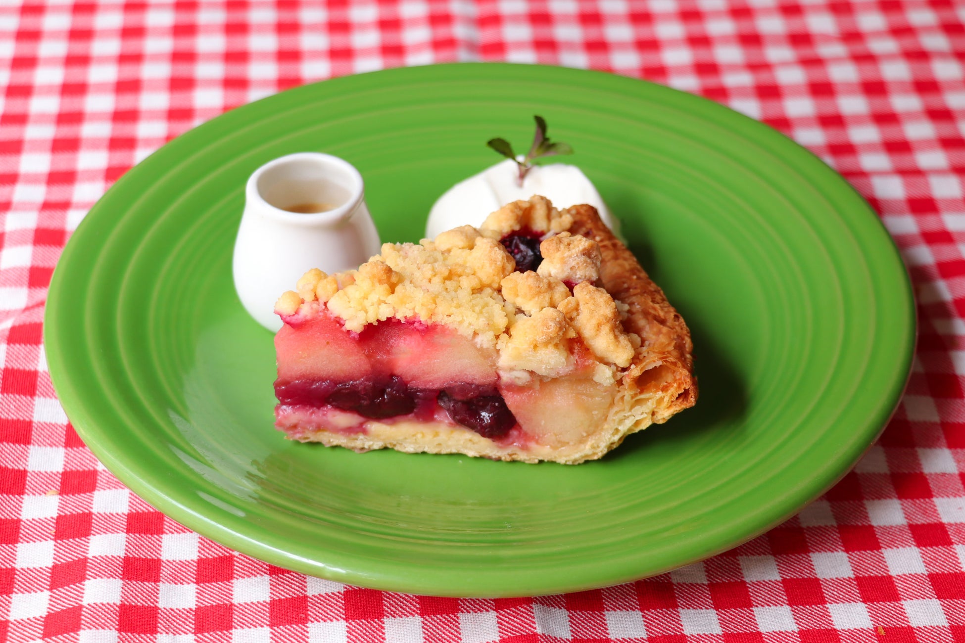たっぷりのりんごの上にはサクサクのクランブルとともに、爽やかな酸味のきいたグリオットチェリーを散らして、華やかに仕上げました。