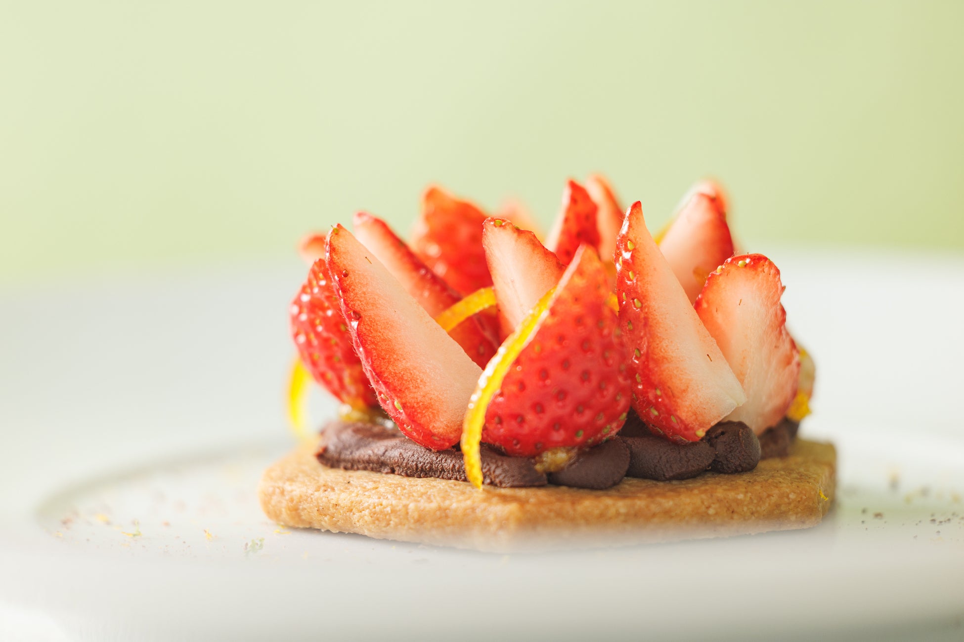 ブランドを象徴する6角形に焼き上げた、バターの風味豊かなビスケットの上に、ペルー産ショコラを使用したガナッシュ、オレンジのマーマレード、オレンジのゼスト、フレッシュイチゴを華やかに盛り付けています。仕上げには、オレンジコンフィをトッピング。春を感じるイチゴのフレッシュ感とオレンジの爽やかさ、ビスケットの風味とサクっホロっとした食感とカカオ75%ショコラのアイスとライムの爽やかなグラニテとともにお楽しみください。