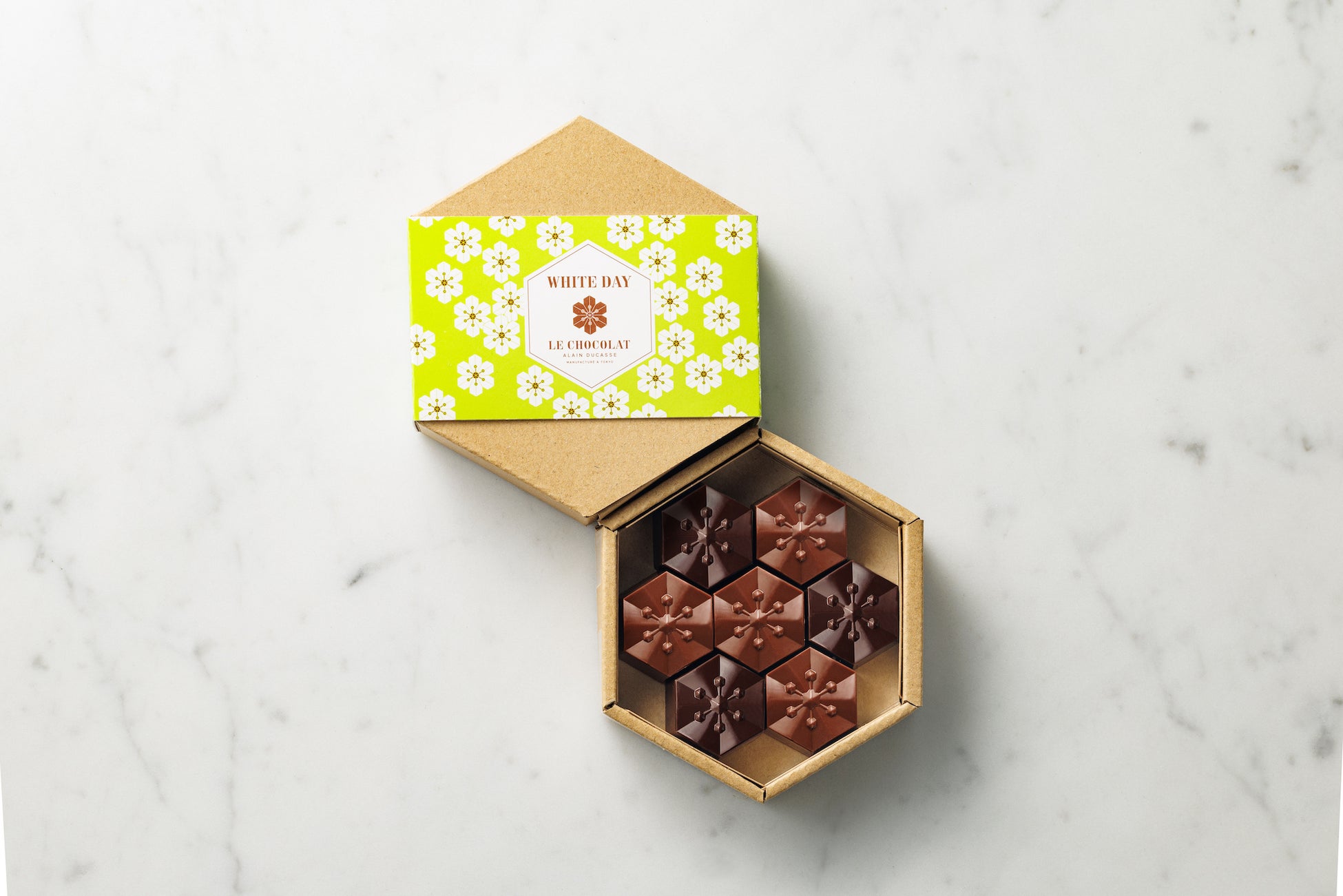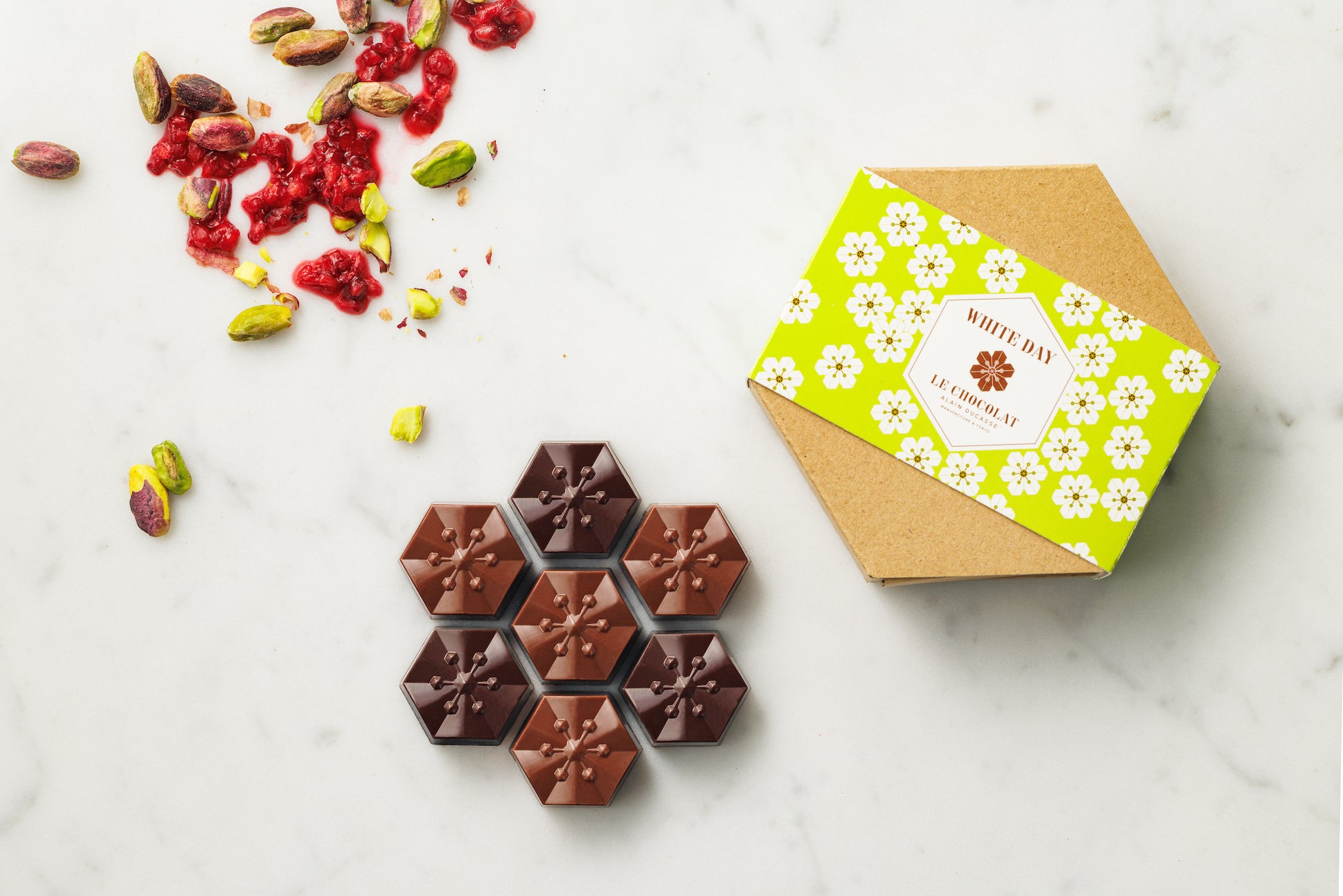 芸術的な幾何学デザインが印象的な桜をモチーフにした春の人気商品。今年はフランボワーズとキャラメルピスターシュの2種のフレーバーの詰め合わせ。フランボワーズは、フルーティーで甘酸っぱいフランボワーズのパート・ド・フリュイ(フルーツの砂糖菓子)とピスタチオのプラリネを、カカオ75%のオリジナルブレンドのショコラ ノワールでコーティング。キャラメルピスターシュは、香ばしく仕立てたキャラメルのガナッシュとピスタチオのプラリネを、カカオ40%のショコラ オ・レでコーティング。中にはピスタチオが一粒入っています。