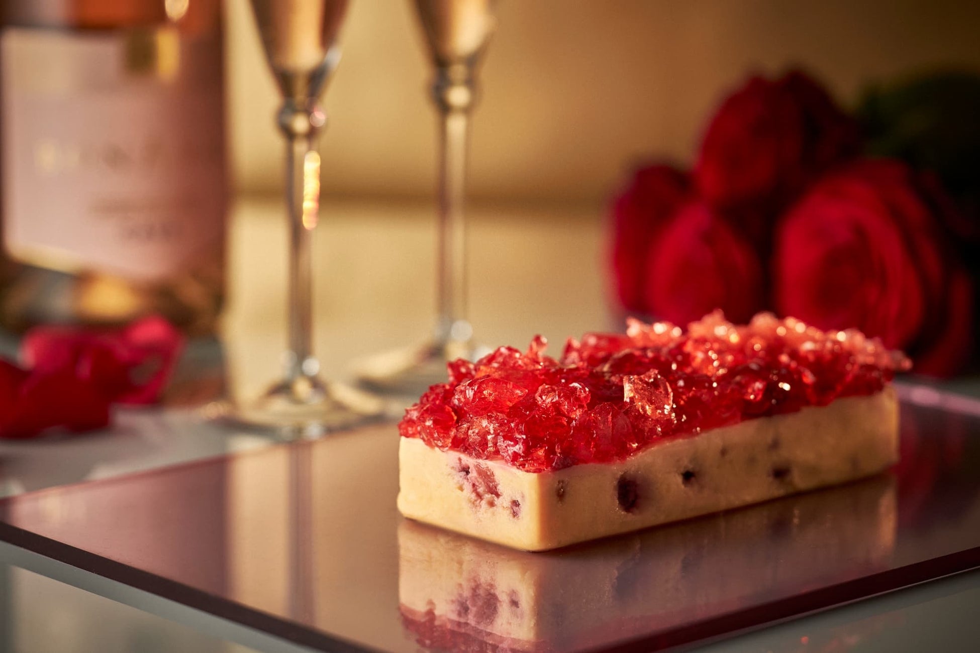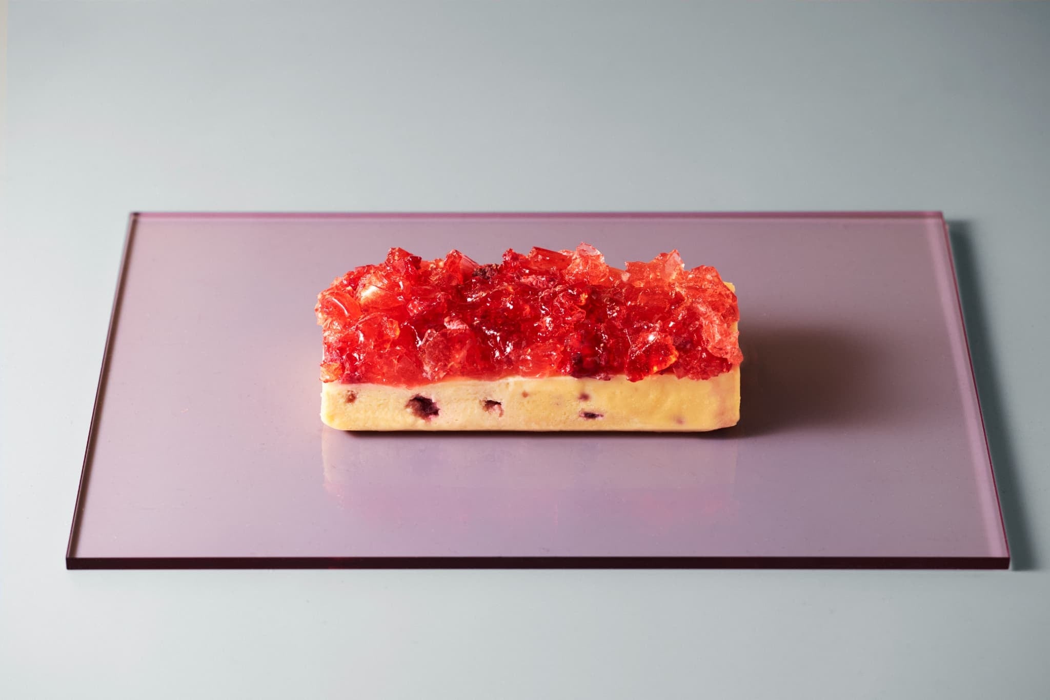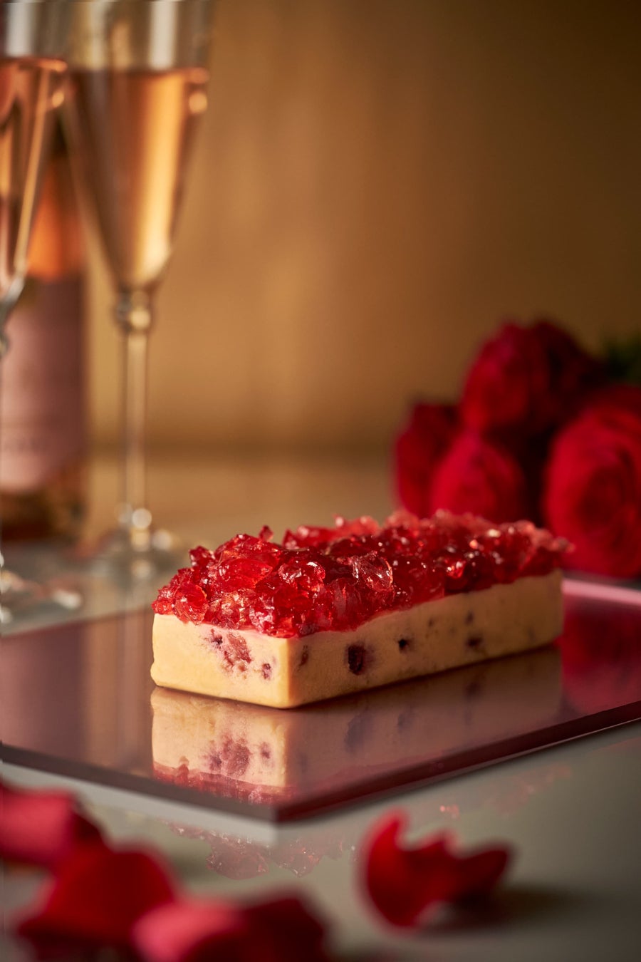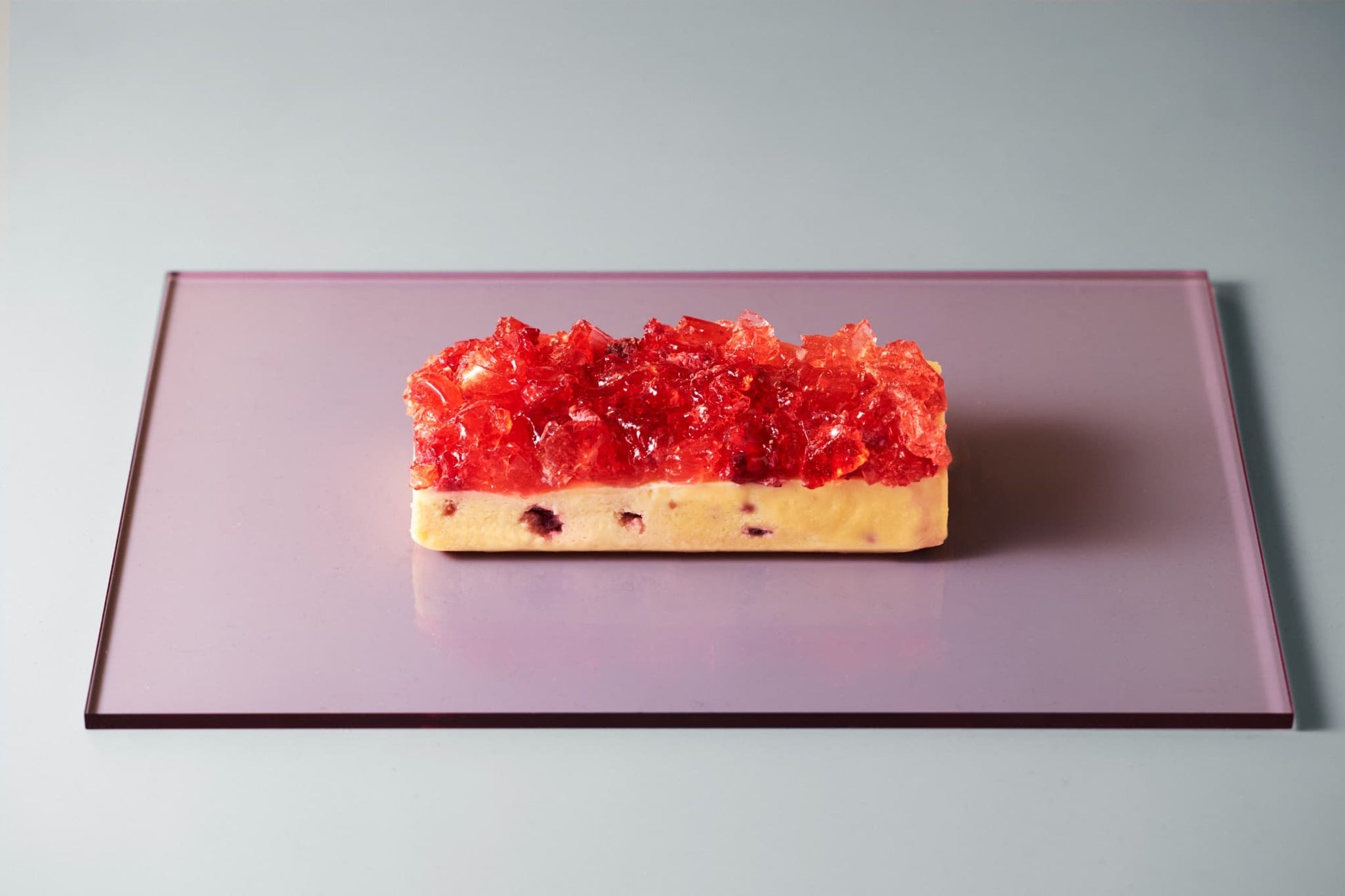瑞々しいフランボワーズの色味を閉じ込め、ロゼシャンパンの透明感を想起させる赤いクラッシュゼリーで表面を鮮やかに彩ります。