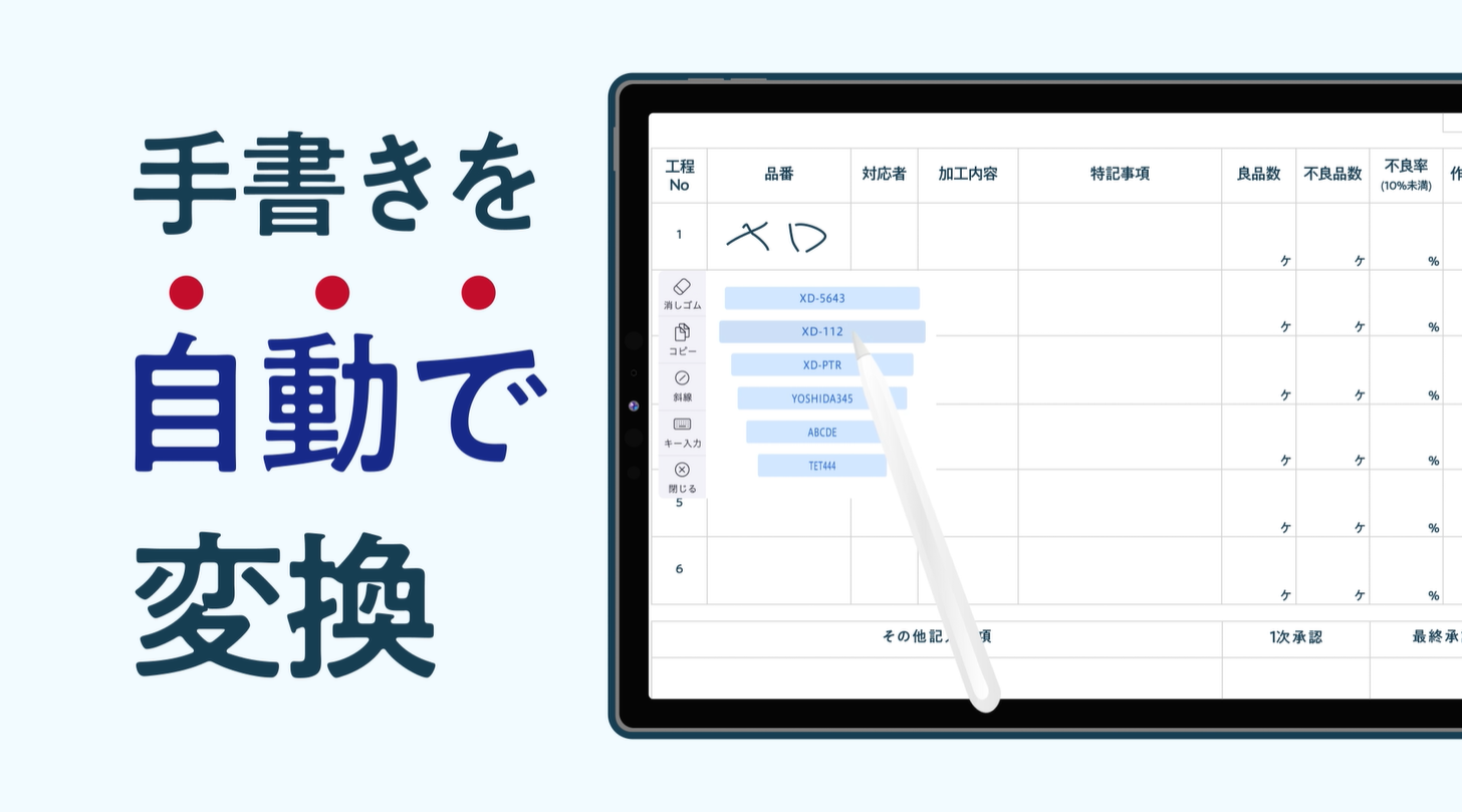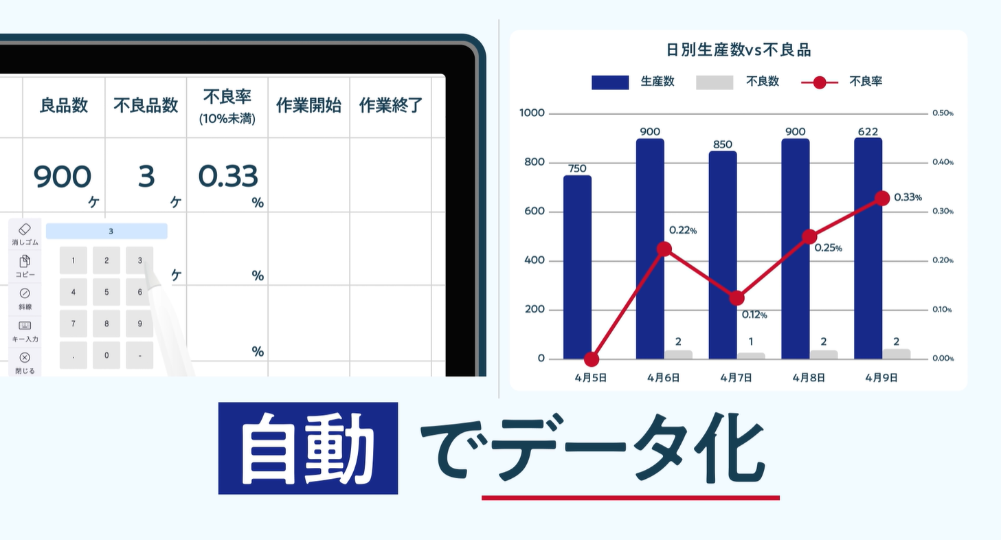 手書きの文字を自動で変換し、リアルタイムでデータ化します。さらに、日別の生産数や不良率などのグラフも自動で作成されるため、これまで手作業で行っていた面倒なExcelへの転記や資料作成の工数を大幅に削減します。