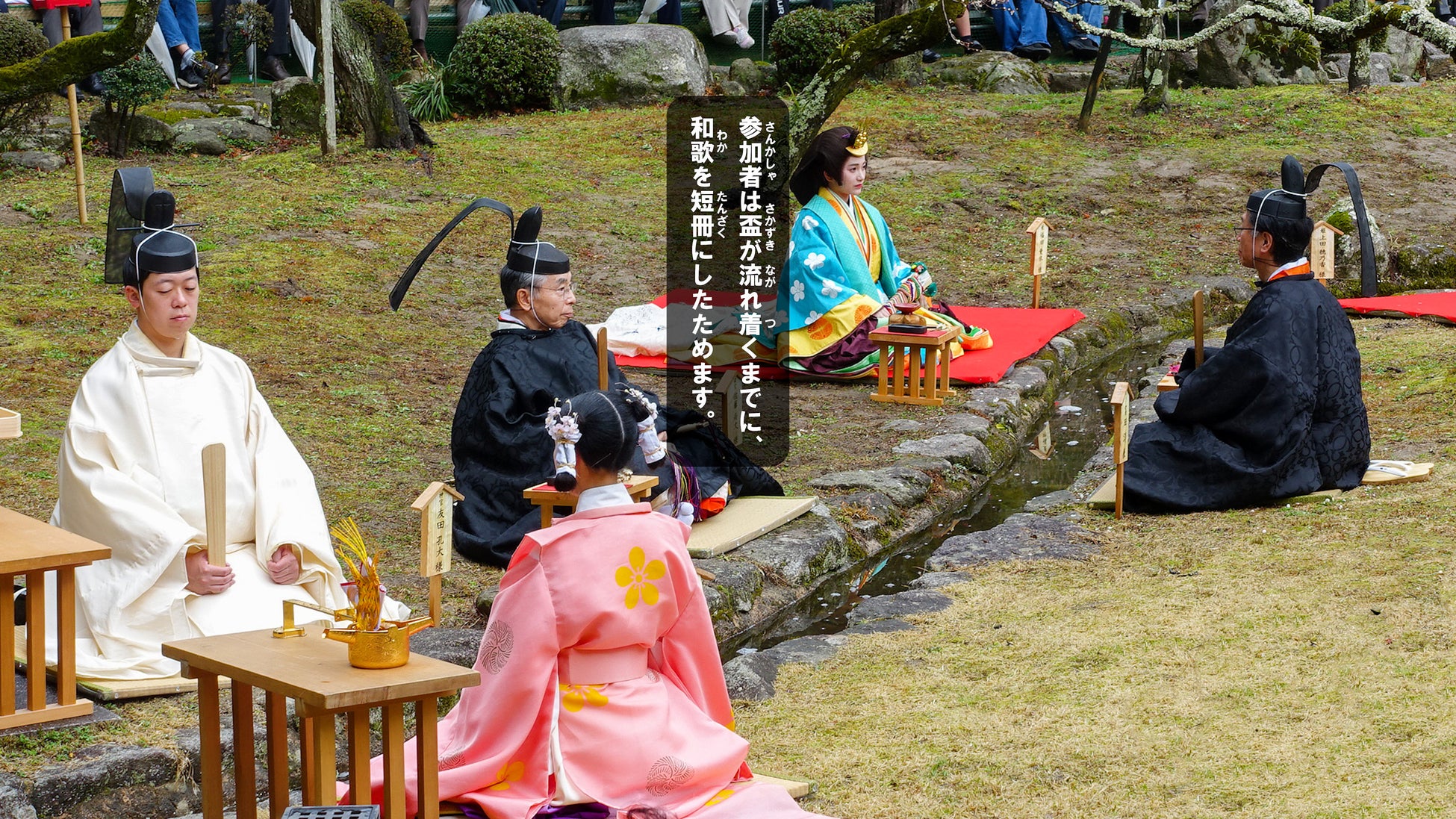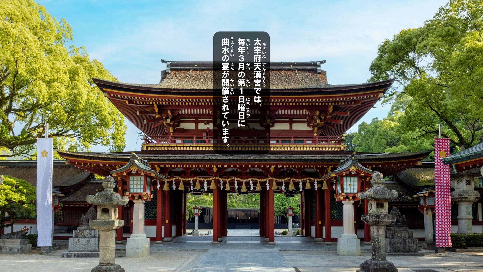 この宴が7世紀後半以降の日本においても宮廷行事として催されてきたこと、やがて太宰府天満宮での「曲水の宴」として現代にも受け継がれていった様子を紹介しています。展示では、4Kディスプレイを使って、4分50秒の本編映像とさらに15秒のショートバージョンを用意しました。今後に向けてVRやAR、タッチパネル展示などへの発展も見据えた制作を行いました。