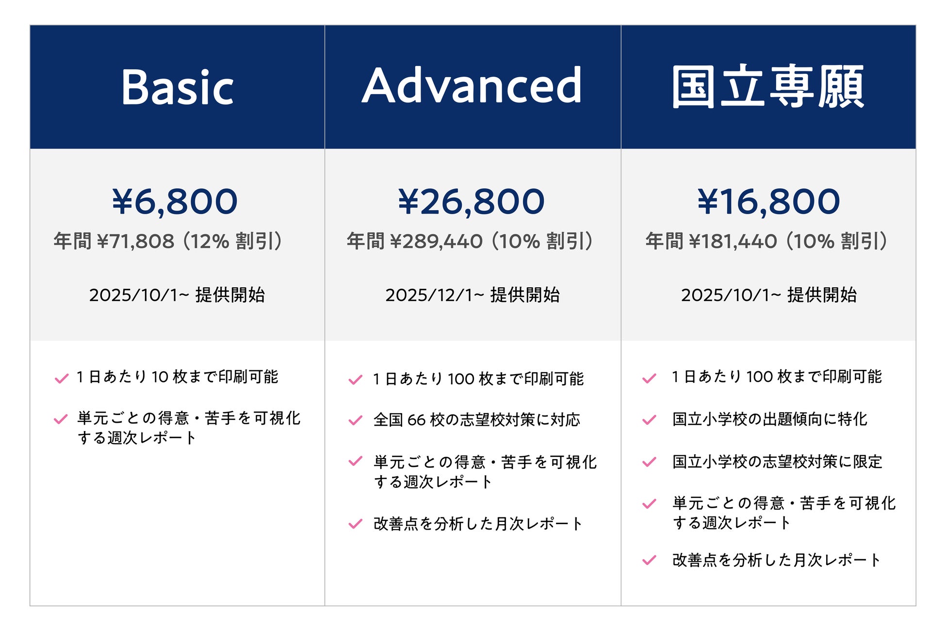AIによる個別最適化と家庭用プリンターの連携により、1日15分、親の準備最小限で学習習慣が身につくことが特徴です。