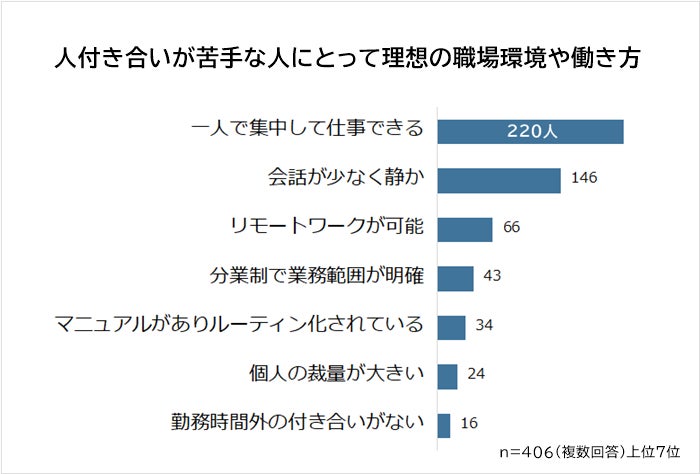 人との関わりが減るような環境・働き方を求めている人が多数。苦手なことを避けるための希望が多く、「人付き合いが苦手でも、話しかけやすい環境」を求めるような回答はランクインしませんでした。