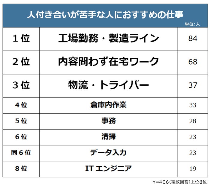 「人付き合いが苦手な人でも快適に働けると感じた仕事」の1位は「工場勤務・製造ライン(84人)」でした。2位「内容問わず在宅ワーク(68人)」、3位「物流・ドライバー(37人)」4位「倉庫内作業(33人)」が続きます。