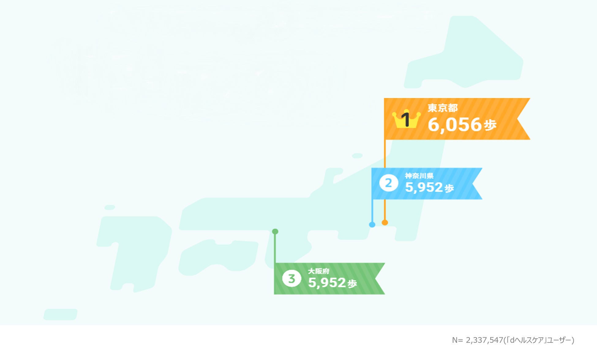 地域別では、東京都が6,056歩で最も高い結果に。都心部では交通インフラが発達している一方で、日常の移動距離が長く、通勤・買い物・余暇などの行動機会の中で自然と歩数が増える傾向が見られます。また、ウォーキングやランニングを日課にする層が多く、「健康意識の高さ」と「都市型ライフスタイル」が両立していることも、今回の結果を後押ししたと考えられます。
