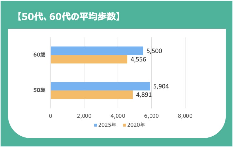 2025年の分析では、50代・60代の平均歩数がいずれも2020年比で約20%増加。