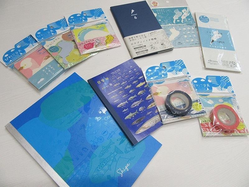 琵琶湖のカタチをしたクリップやふせん、琵琶湖がスラスラ描けるテンプレート、琵琶湖のお魚・滋賀の旅をイメージしたマスキングテープなどなど、滋賀の魅力がギュッと詰まった文具セットです。