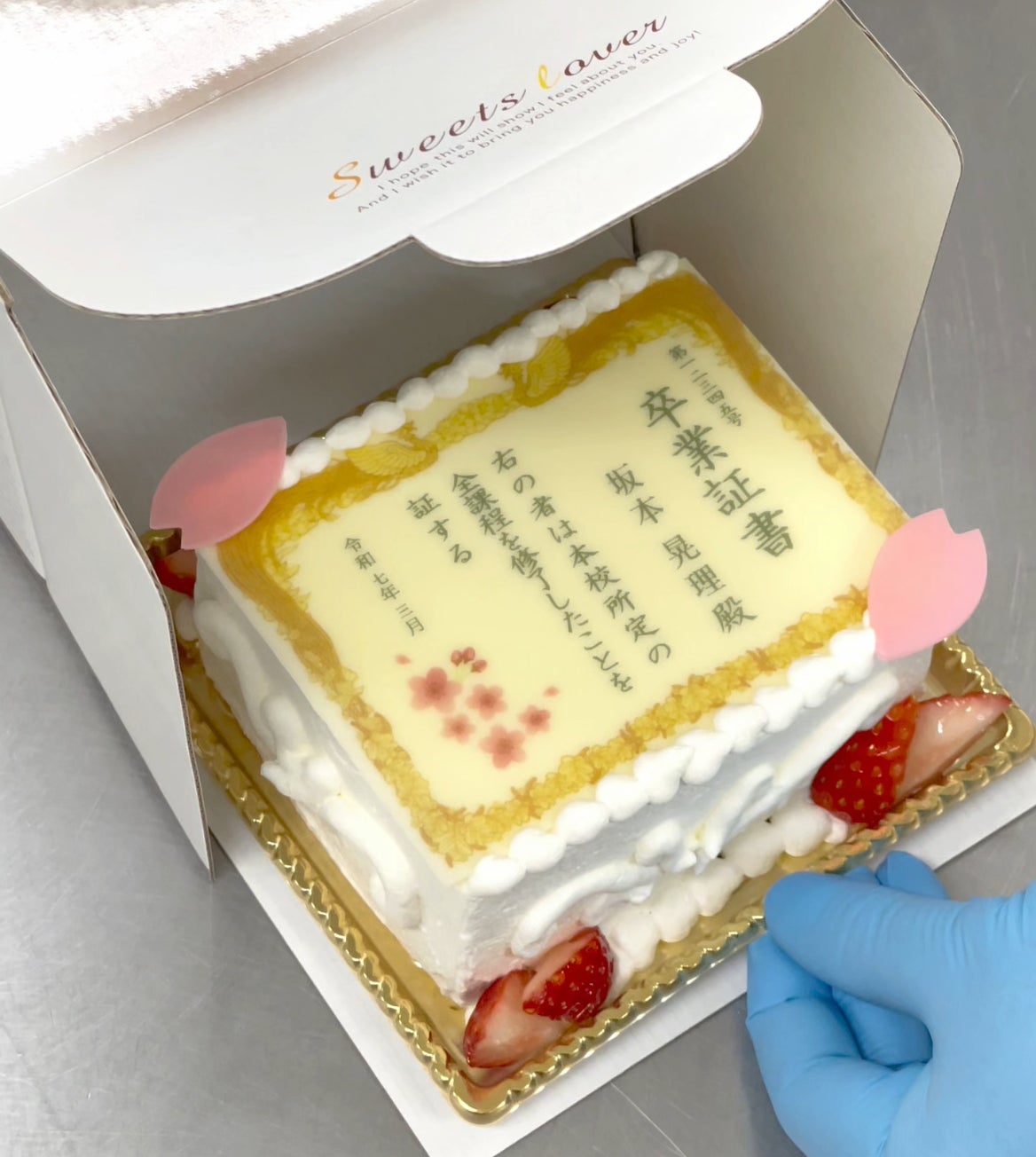 ホワイトチョコレートの板チョコに賞状イラストをプリントアウトし、角型の苺ショートケーキに乗せたデコレーションケーキです。