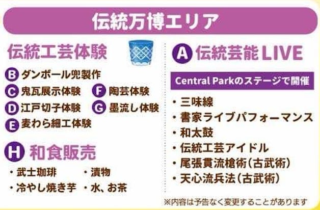 伝統工芸体験として、ダンボール兜製作・鬼瓦展示・陶芸・江戸切子・墨流し・麦わら細工の簡易体験などが予定されているほか、日本の伝統芸能である和太鼓や三味線のステージパフォーマンスや、武道の演武なども行われる予定です。また、飲食エリアでは、漬物や冷やし焼き芋などの和食販売が行われます。