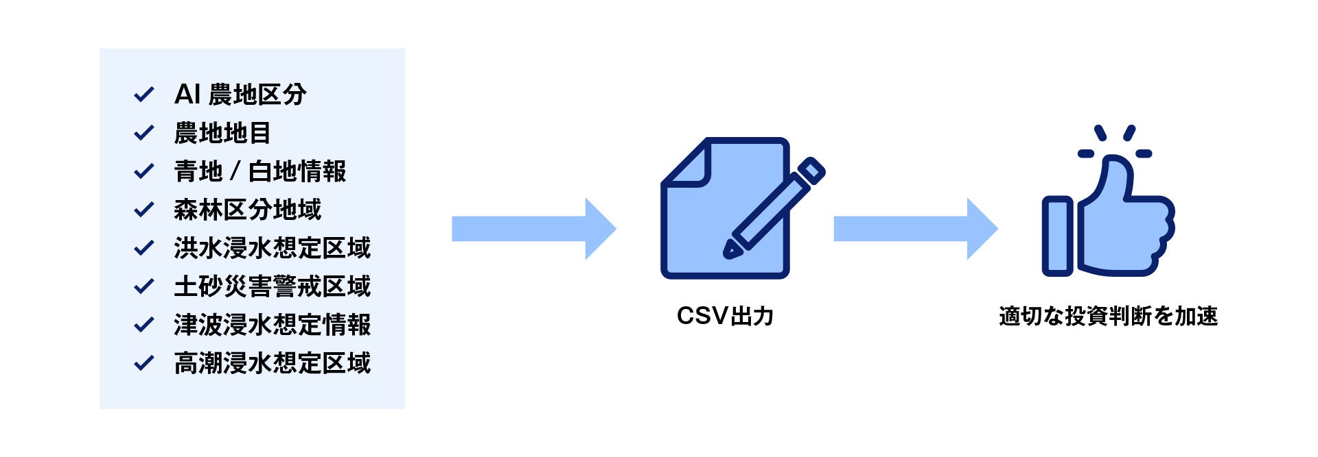 『WHERE』の最大の強みである衛星データによるAI探索と組み合わせ、広域から短時間で候補地を効率的に抽出。加えて今回のアップデートで、田畑の区分予測や行政要件・ハザード情報を地図上で重ね合わせることができ、白紙化リスクの排除と探索工数の大幅削減が可能です。