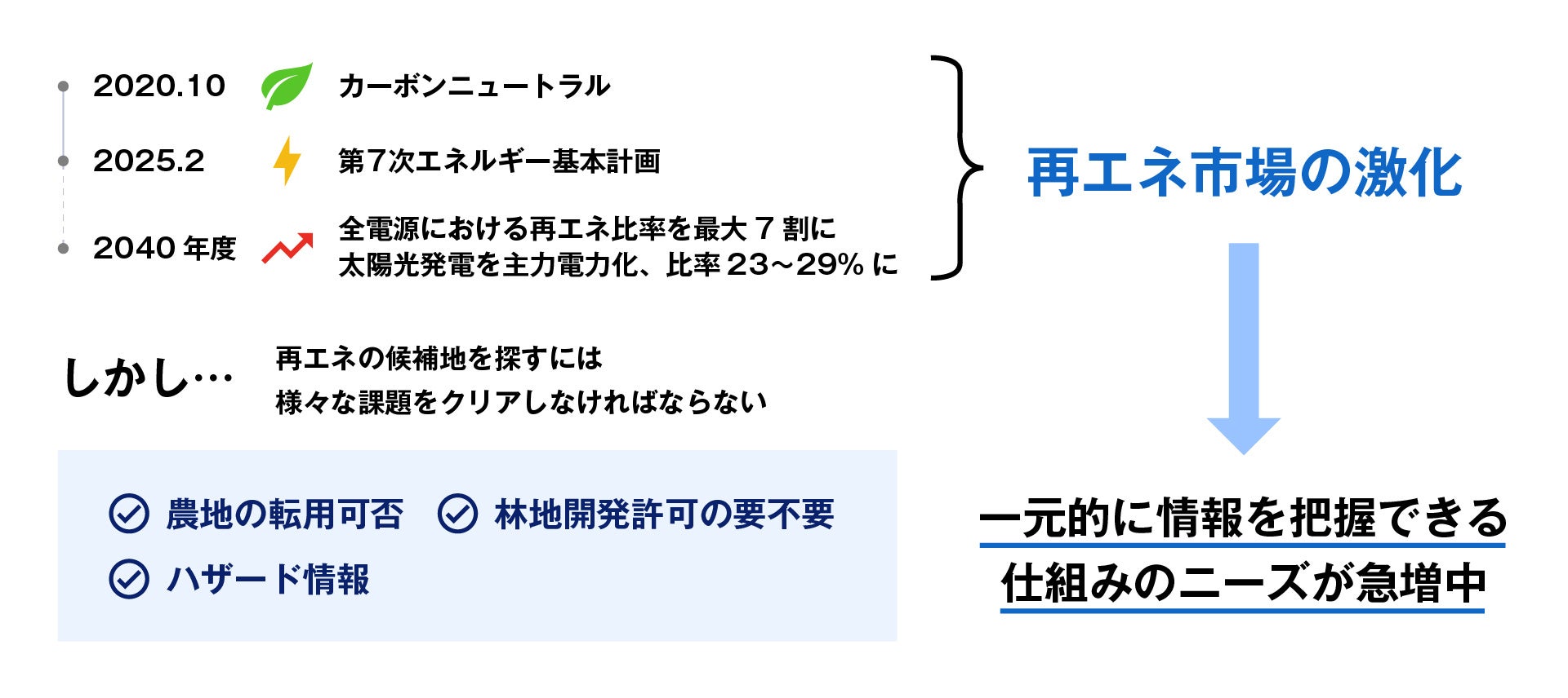 こうした状況において、太陽光発電所や系統用蓄電所設置のための「候補地選定」は、再生可能エネルギー事業やインフラ開発の成否を左右する極めて重要な要素です。しかし、現実には候補地の選定に多くの課題が存在します。農地(田・畑)の転用可否や、林地開発許可の要不要といった農地法・森林法・都市計画法に基づく規制、さらには洪水・土砂災害などのハザード情報等、確認すべき要件が多岐にわたり、そもそもの候補地選定や、現地調査や自治体への個別確認に多くの工数がかかっているのが現状です。こうした情報を一元的に把握できる仕組みへのニーズは、再エネ・インフラ開発において年々高まっています。