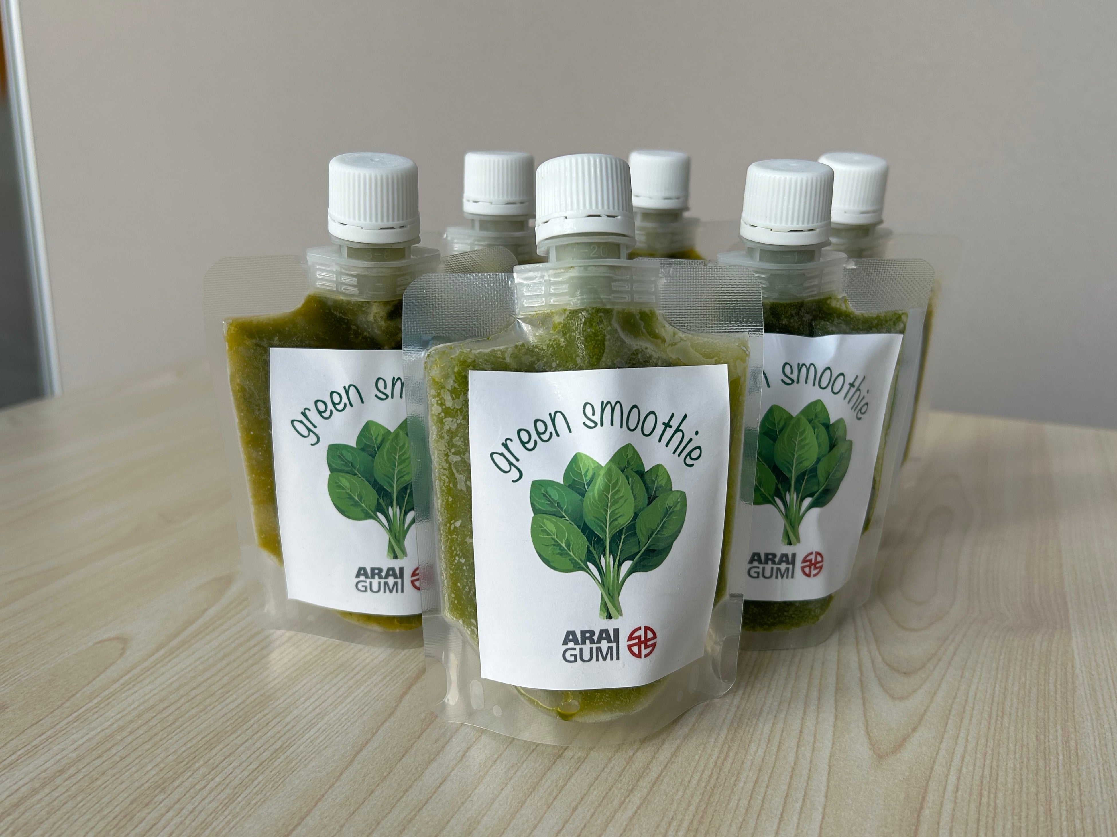 新井組が育てた健康野菜の中から、小松菜を原材料にしてグリーンスムージーをつくっています。