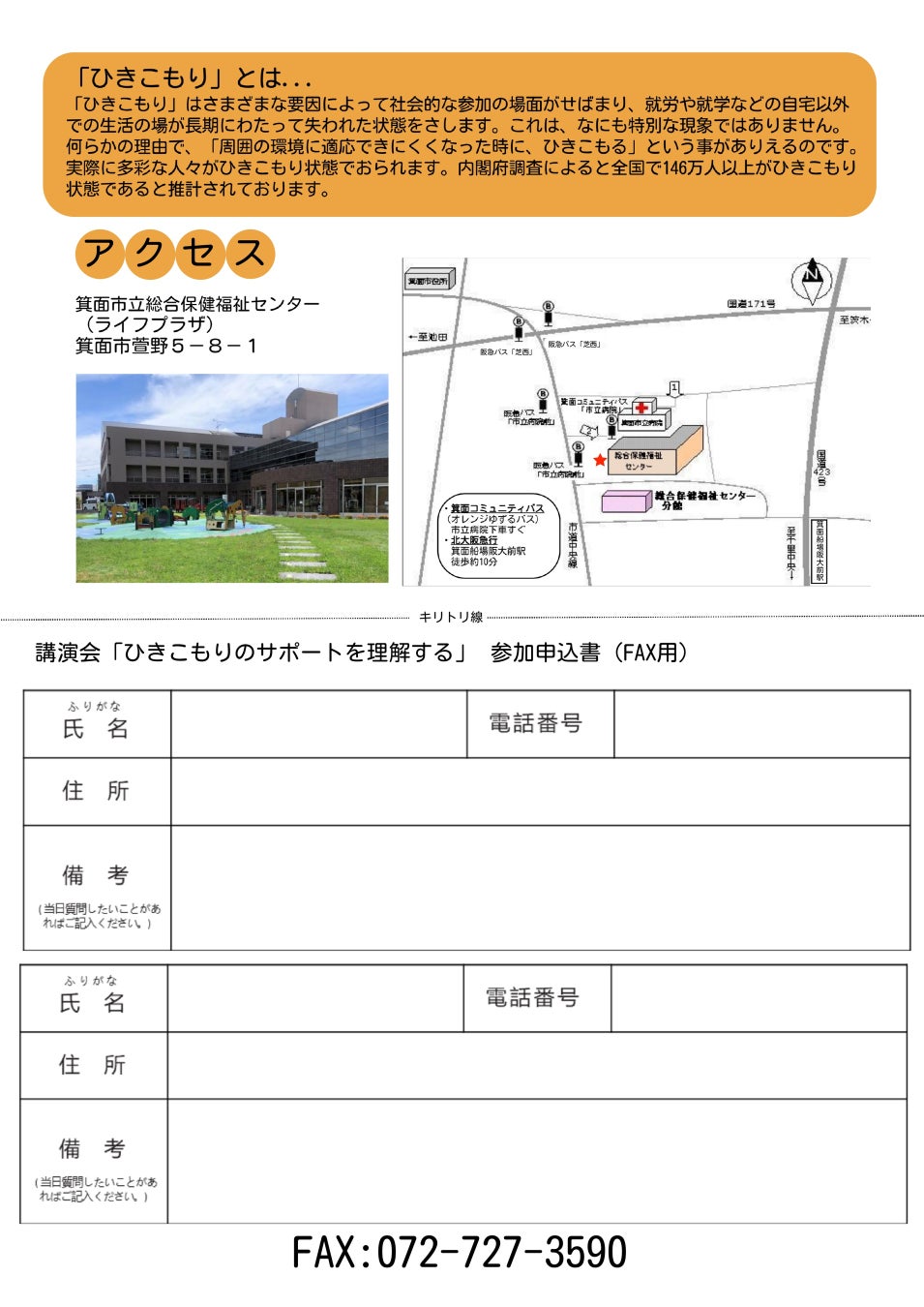 ひきこもり相談窓口では昨年に引き続き、ひきこもりに関する講演会を開催します。今回のテーマは「ひきこもりのサポートを考える」として、地域社会でひきこもり状態のかたをどう支えていくか等について、講師からの講演や講師とボランティアとの対談を通して理解を深めます。
