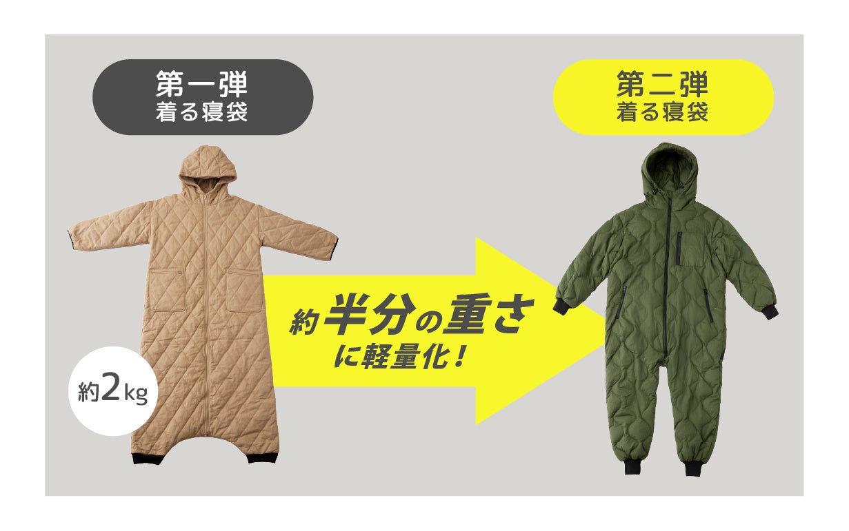 寝具メーカーのノウハウとキャンパーの意見をもとに改良を重ねて完成した着る寝袋の第二弾。羽毛布団にも使われる「ダウン原料」を採用し、より軽くより暖かくなりました。