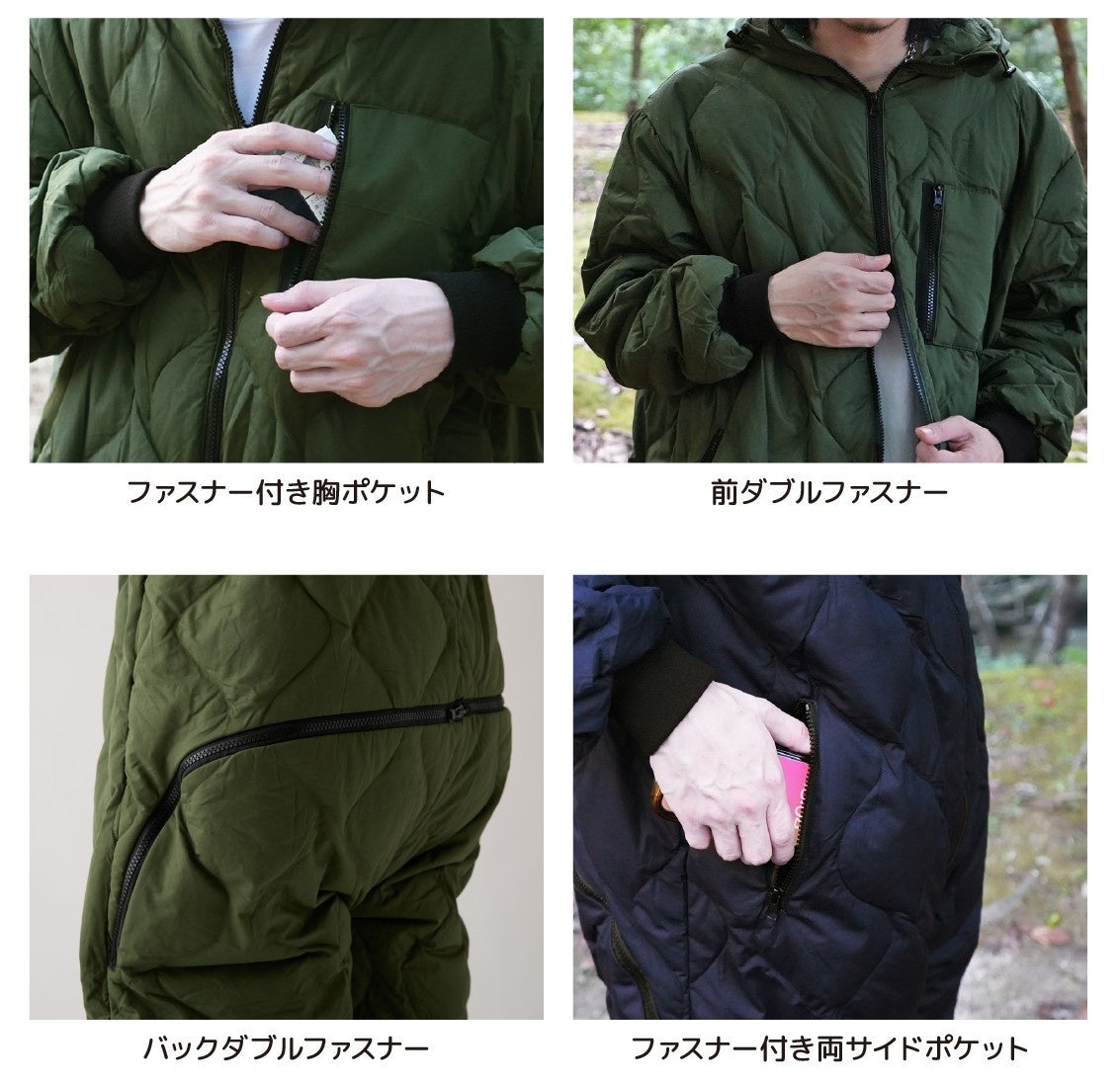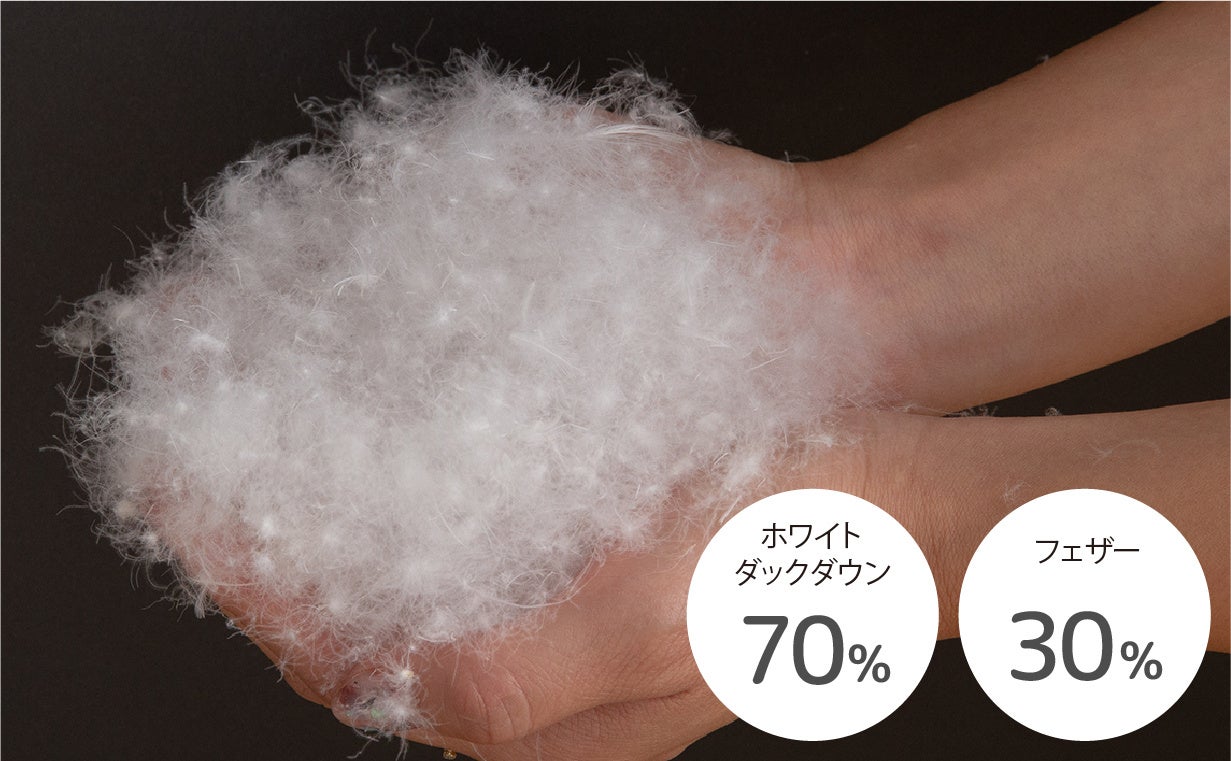 今回の企画では、従来品の課題であった重さを改善すべく「羽毛布団のように軽くて暖かい」着る寝袋を目指しました。布団の卸・小売販売業を約30年営んできた寝具メーカーAQUAが羽毛布団を作る際のノウハウをいかし、着る寝袋に最適なダウンを厳選した結果、ホワイトダックダウン70%とフェザー30%を採用。ダウンはポリエステル綿と比べて軽いため、従来品と比較して約50%の軽量化を実現。さらに「かさ高」が大きく空気の層を多く含むことで保温性を高め、暖かさが続きます。