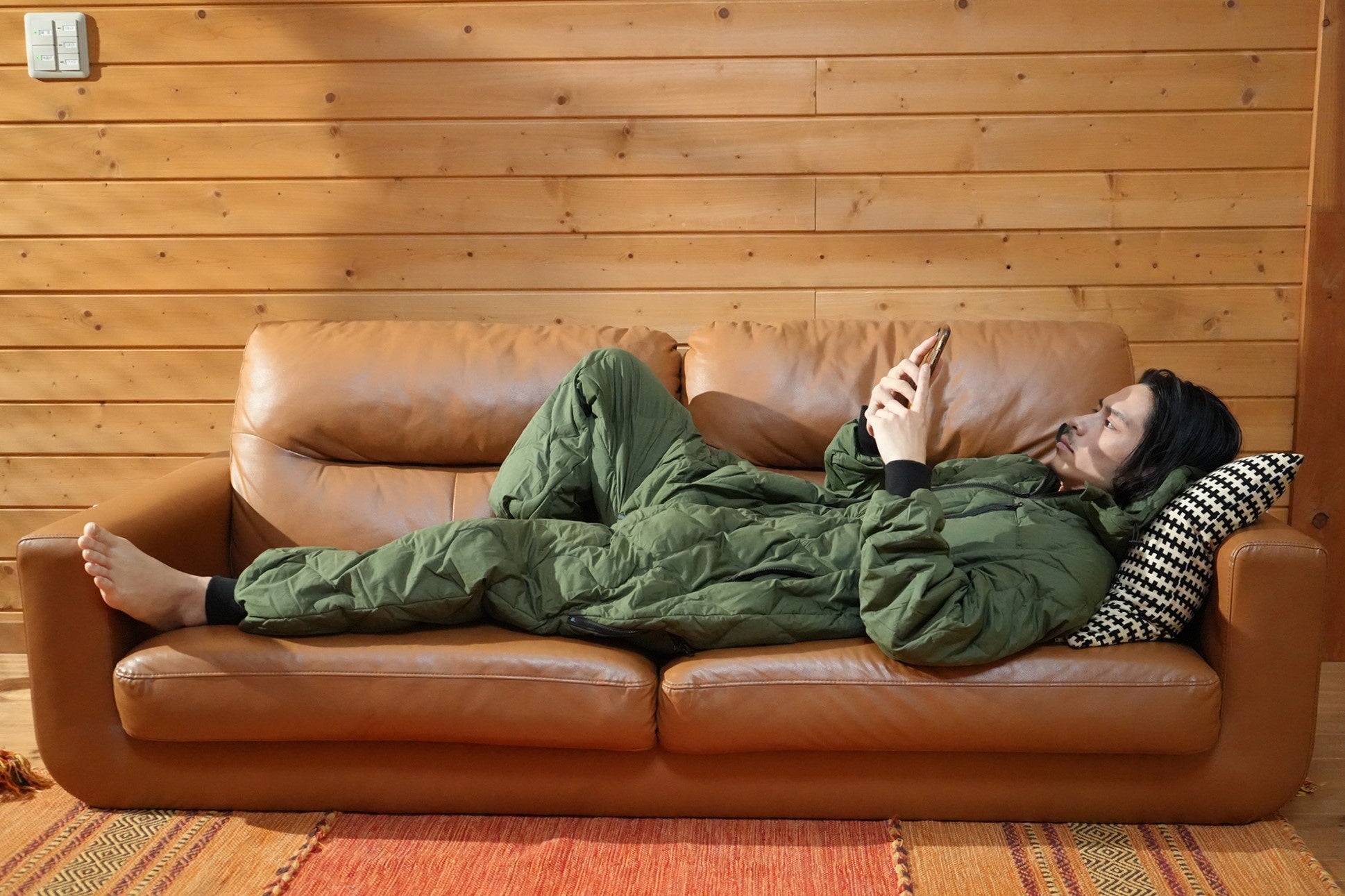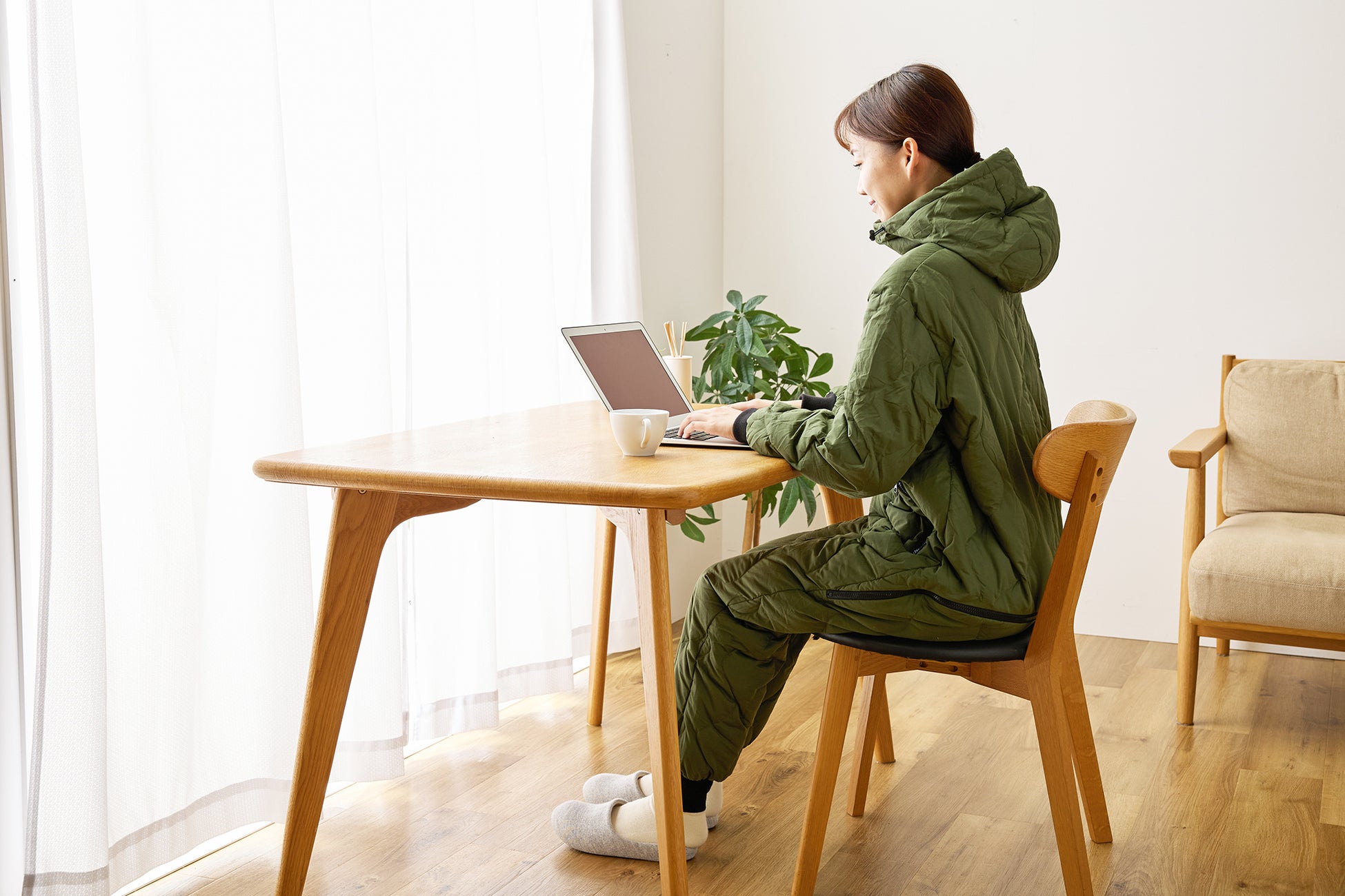 キャンプ以外に、在宅ワーク時やくつろぎタイムのルームウェアとしても活躍。普段の洋服の上に着るだけなので手軽に防寒対策ができ、光熱費高騰が続く中で節約にも繋がります。