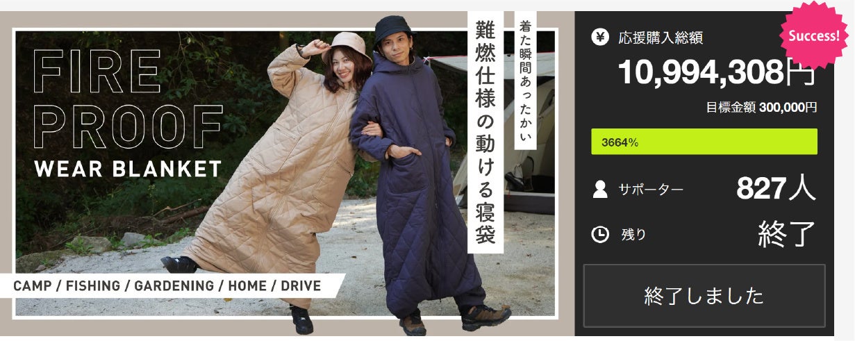 株式会社AQUA(本社:神奈川県横浜市、代表取締役:藤井裕士)が9/28(土)からMakuakeにて先行販売を開始した本格ダウン入りの着る寝袋(第二弾)が、プロジェクト開始2日で目標金額2,000%を達成しました。
