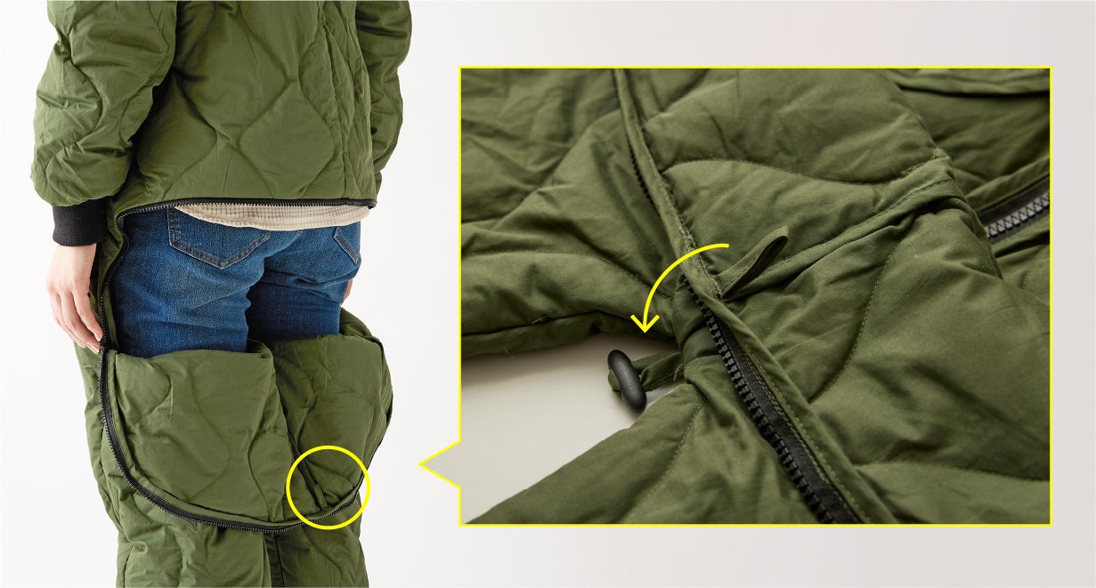 ポケットの位置やファスナータイプ、トイレ使用時のための「バックダブルファスナー」など、キャンパーのリアルな声をもとに設計。「バックダブルファスナー」は、後ろに開き垂れさがる部分が邪魔にならないよう、前でループ止めができる仕様です。