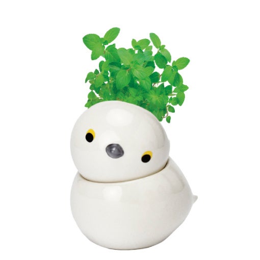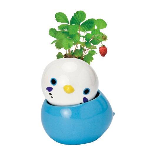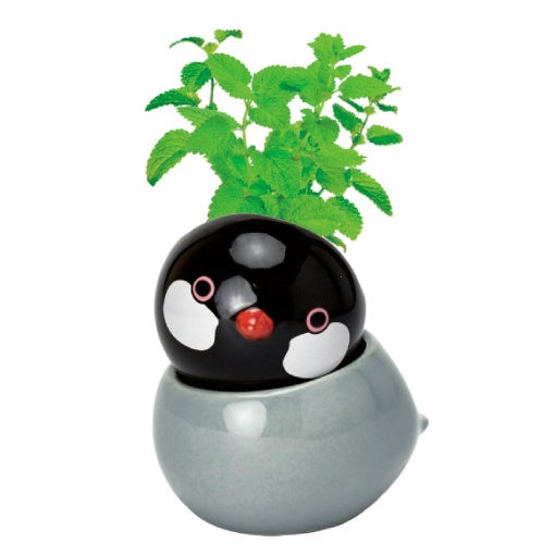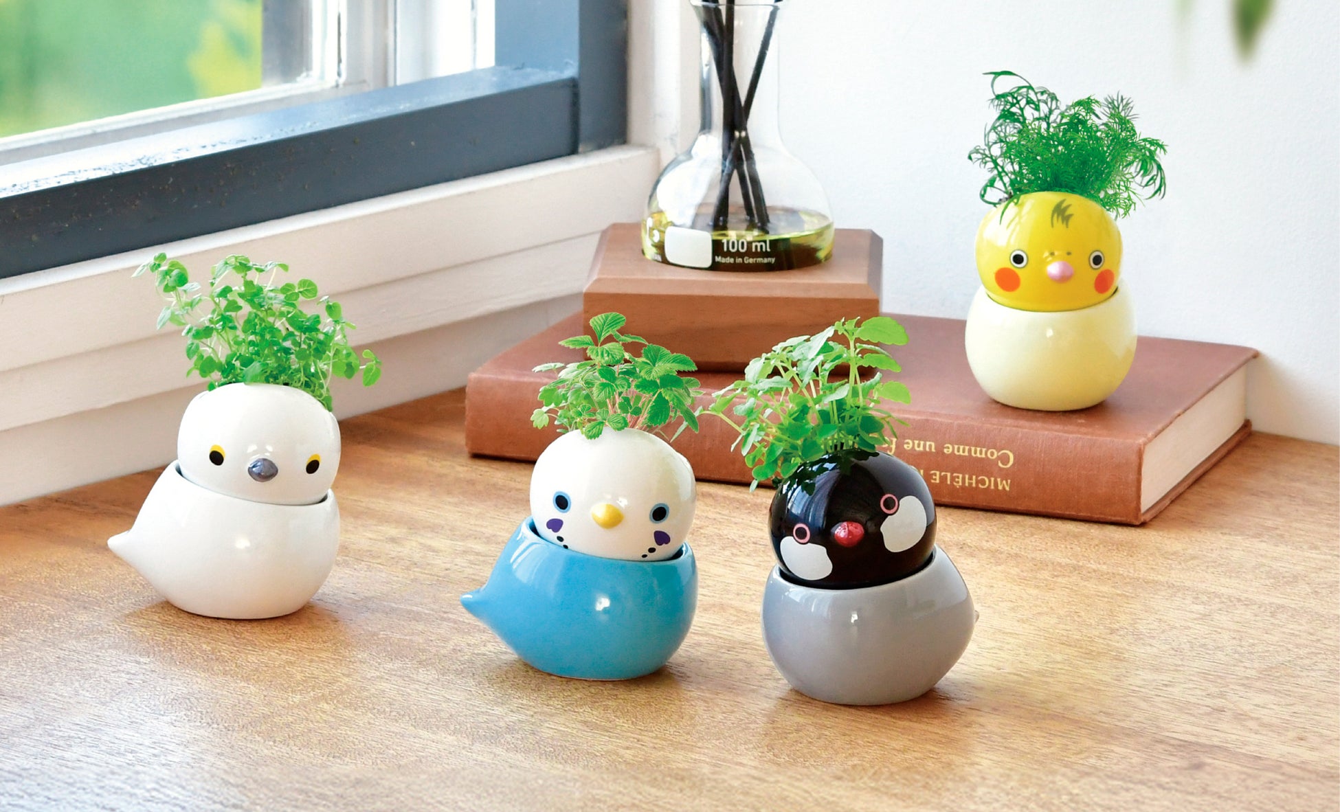 頭部には植物を育てられるスペースがあり、膨らむ土を使って育てる、扱いやすいハーブを採用しました。身近で親しみのあるシマエナガ、ブンチョウ、セキセイインコ、オカメインコの4種類をラインアップし、それぞれ小鳥の模様や色合いを表現しています。