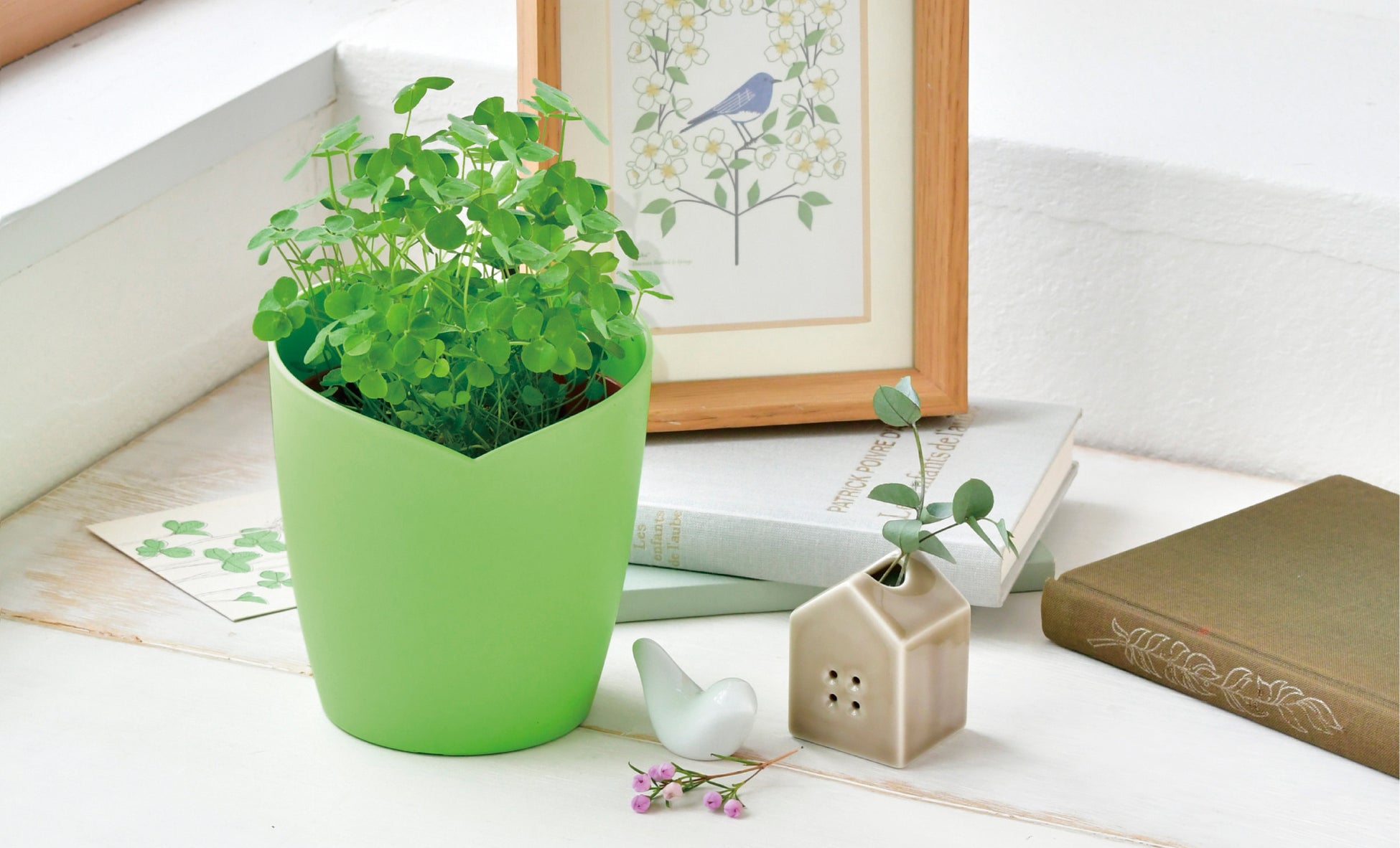四葉のクローバーはグリーンのハート型のポットで育成。パッケージは幸せを運ぶ小鳥をあしらった、より新しいデザインにリニューアル。贈りものとしても選びやすい、華やかさのある仕立てになっています。今季のテーマに合わせ、幸せを運ぶ小鳥をあしらったデザインに刷新しました。