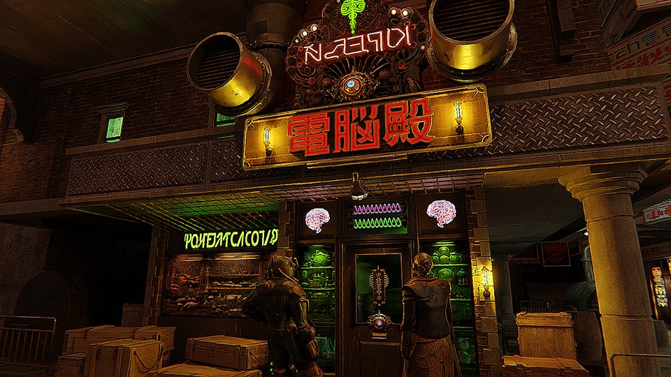 「電脳殿」は、遷移圏中を巡る3人組の組織 アッケンボルタが、メンバーの出身であるドルハーンの伝統的な文化「身体からの解放・本当の自己の追求」の浸透のため、「電脳部品・生体部品の販売」を目的として燈禾に設立された店舗です。この度は、ドムシアット新繫栄軸にて流行しているメタバース文化に着目し、遷移圏の衣服の電脳情報化およびドムシアットでの販売を開始いたしました。