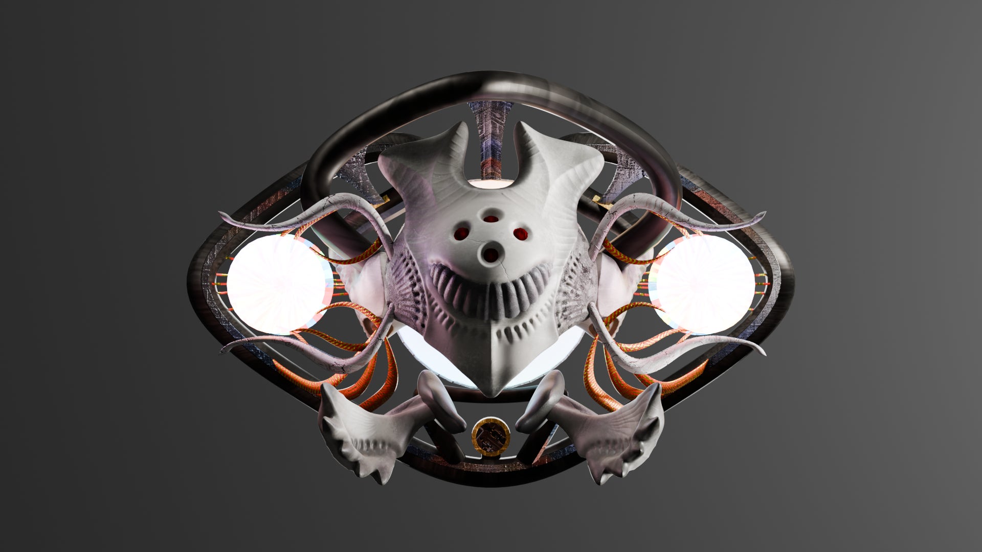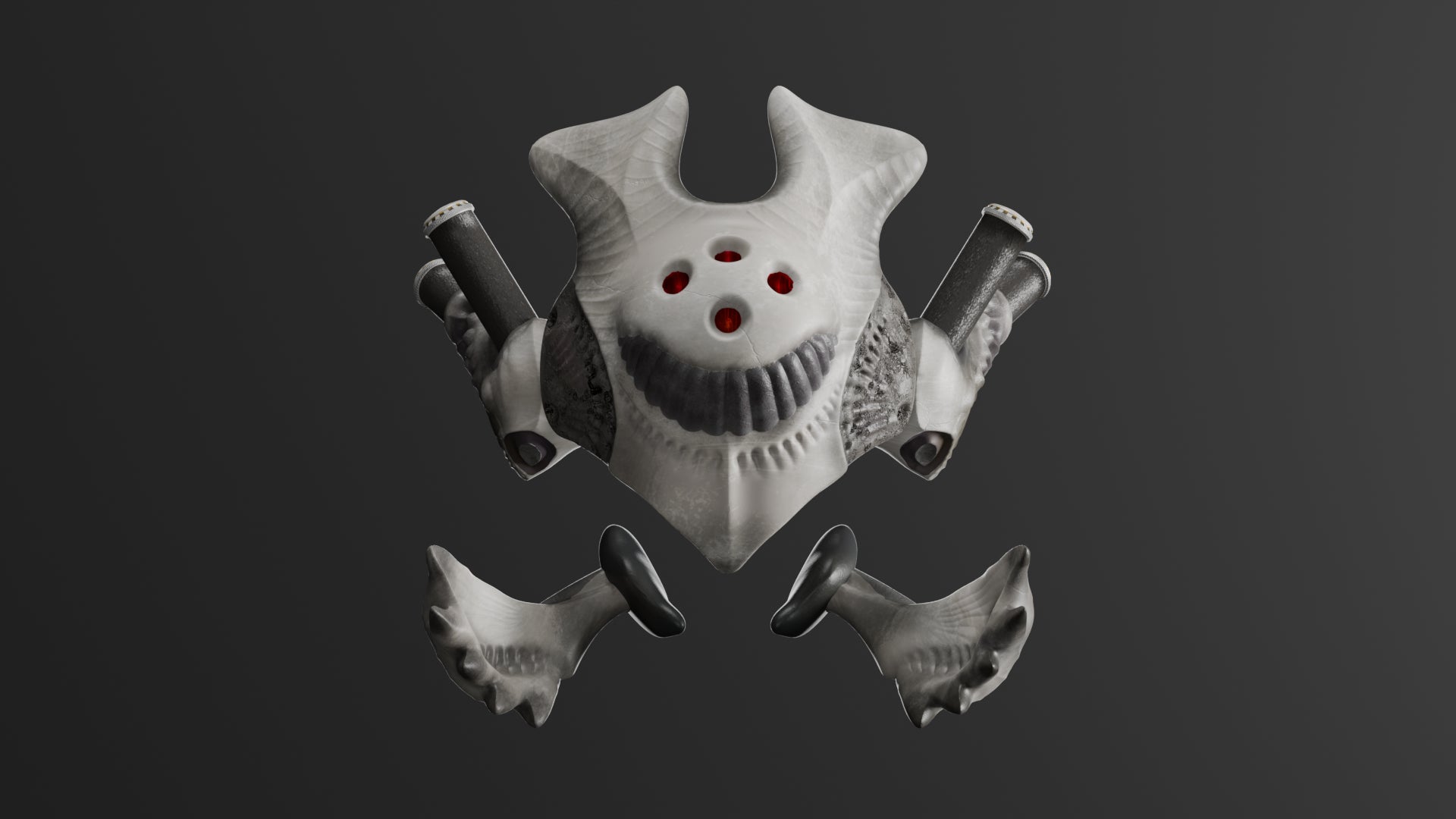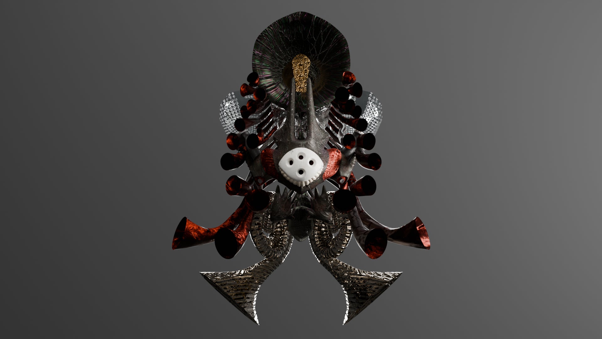 電脳殿と株式会社harmonyは、2024 年に発売した第一弾衣装が VR Chat 内外でどのように着用・改変されているかを調査し、モルキアット文化の核である “生体部品”がVRChatで活用されうることに着目しました。生体部品とは、モルキアット旧繫栄軸にて生み出された、体に新たなパーツや機能を付け足す「拡張身体技術」に使用される部品を指します。これらのパーツをドムシアット日本のメタバースで用いられる身体に合う形でデジタル化し、提供するプロジェクトを発足しました。第一弾として、今後の商品のベースとなるマスクとして「マスク=アルキ」の予約を開始し、予約特典として同じ機能を持つマスク「マスク=ガンテ」の限定モデルが同梱いたします。