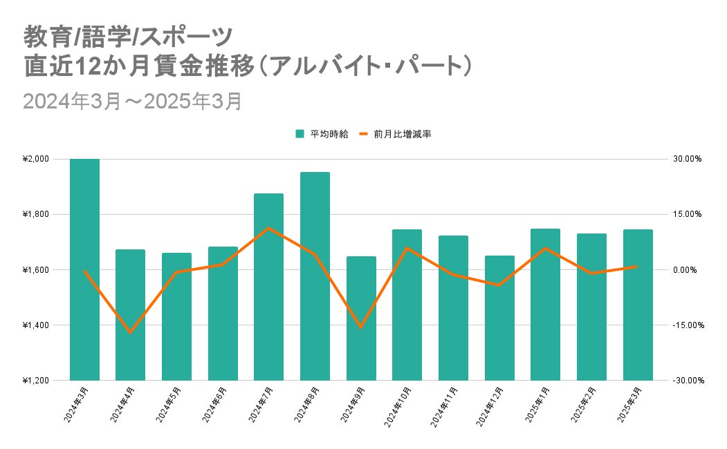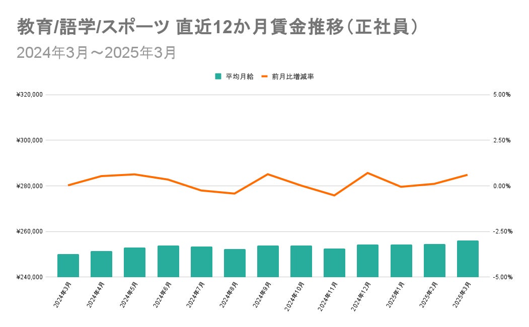 1位の「教育/語学/スポーツ」と17位の「クリエイティブ(Web系)」の直近12か月の賃金推移を比較すると、「教育/語学/スポーツ」の平均月給は2024年3月から2025年3月にかけて横ばいで推移しています。