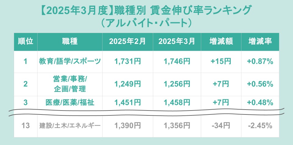 アルバイト・パートの職種別賃金伸び率ランキング(前月比)トップ3は、1位が「教育/語学/スポーツ」(増加額+15円、増加率+0.87%)、2位が「営業/事務/企画/管理」(増加額+7円、増加率+0.56%)、3位が「医療/医薬/福祉」(増加額+7円、増加率+0.48%)でした。