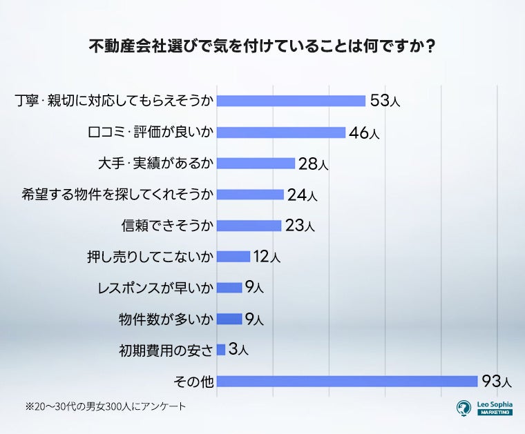 調査の結果、「丁寧・親切に対応してもらえそうか」を重視する人が最も多く、不動産会社の対応品質が顧客の意思決定に大きく影響することが明らかになりました。