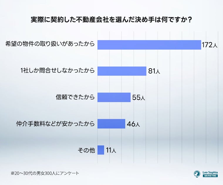 この結果から、希望の物件を取り扱っているかどうかが契約の最大の決め手になっていることが分かります。