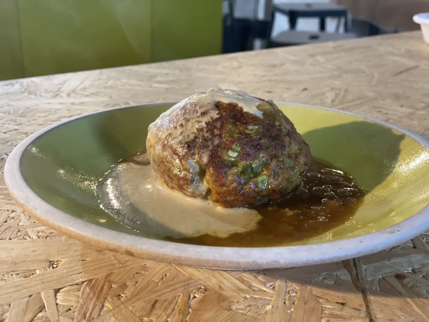 チキンカレーがベースの巨大たこ焼き風カレーボールです。生地にカレー専門店の本格チキンカレーが入ったカレーボールに特製カレーソースが添えられ、カレーと「こなもん」のマリアージュが楽しめるボリューム満点のメニューです。通常のたこ焼きよりも大きく、食事にもおやつにも楽しんでいただけるメニューです。