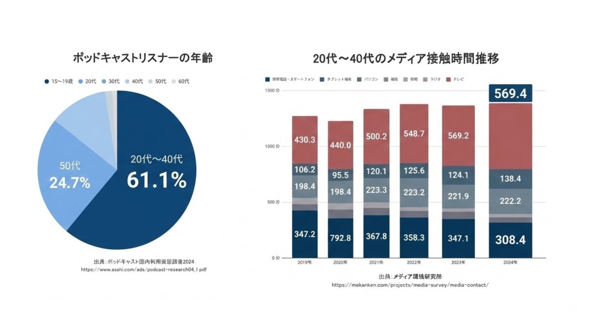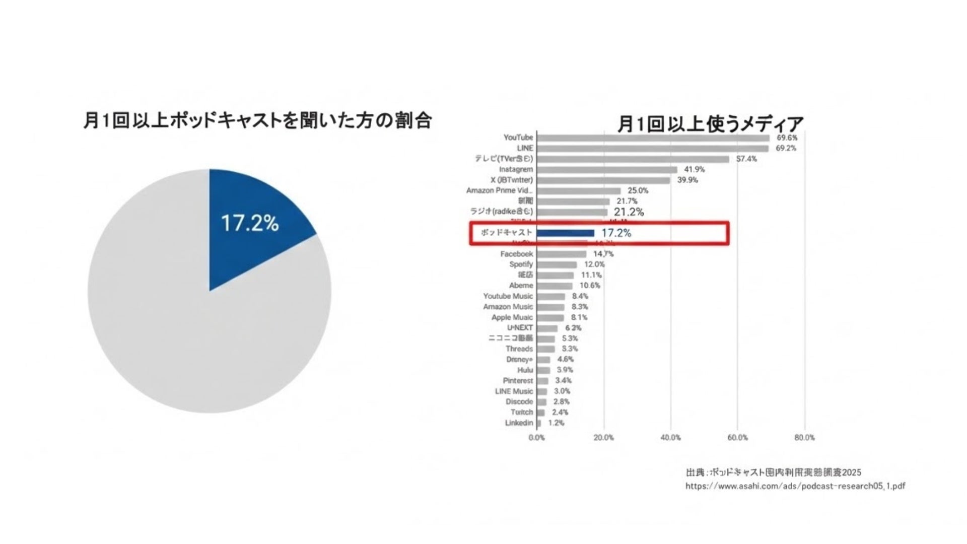 日本では現在、1,840万人が毎月ポッドキャストを聴取。オトナル・朝日新聞調査では、月間利用者数がラジオに近づいており、新たな広告媒体として注目されています。