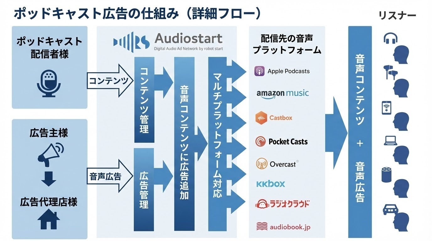 配信先: ロボットスタートが提携する大手ラジオ局が運営する人気番組およびアドネットワーク。