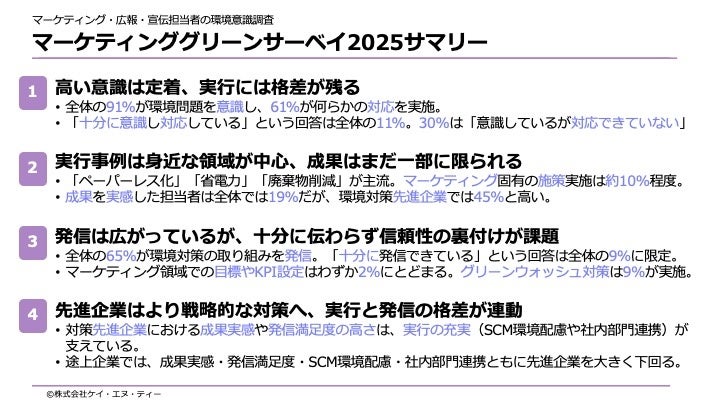 株式会社ケイ・エヌ・ティー(本社:東京都渋谷区)は、全国のマーケティング・広報担当者1,231名を対象に実施した「マーケティング グリーンサーベイ2025」の結果を発表しました。本調査では、 企業の環境対応における「実行」と「発信」の関係性を可視化し、環境施策の成熟度が高い企業ほど、活動の広がりと発信の整合性が連動する傾向が明らかになりました。一方で、発信の手応えは全体的に低調で、「信頼性の担保」を意識した取り組みは一部にとどまる結果となっています。環境対応の実践を可視化し、どのように社会的信用やブランド価値の向上へと結びつけていくか、が今後の焦点となります。