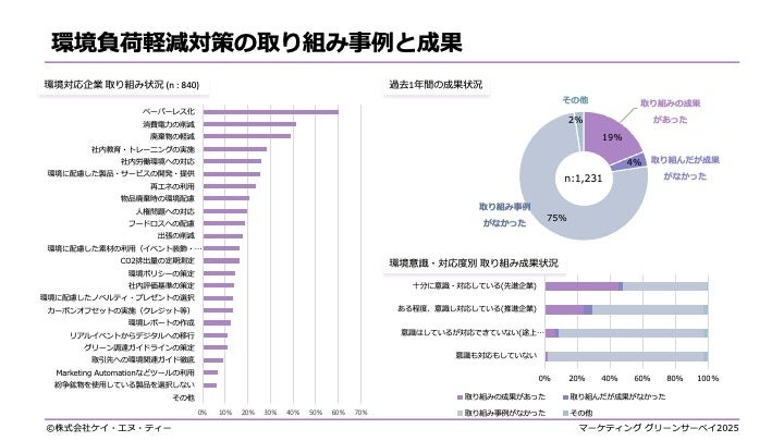 対応内容は「ペーパーレス化(60%)」「省電力(41%)」など比較的身近な施策が中心で、マーケティング部門ならではの取り組み(環境配慮型イベント、ノベルティ選択 等)は1割程度にとどまった。成果を実感しているという回答は全体では19%だが、先進企業に限ると45%となる。